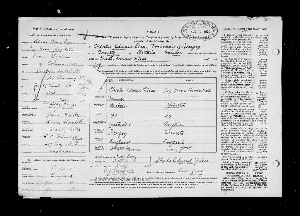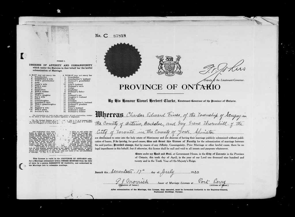On 17 July 1920 he married Ivy Irene Thornhill at Port Perry, Ontario.