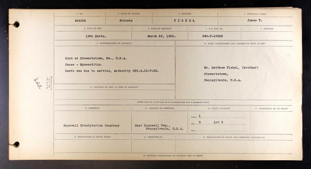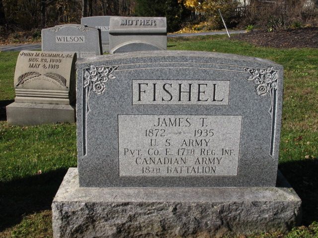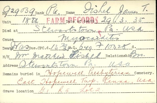 Family Search: When Private James Thomas Fishel was born on 25 March 1872, in Pennsylvania, United States, his father, Joseph Taylor Fishel, was 23 and his mother, Mary Trout, was 22. He married Minnie B. Spencer on 24 December 1901, in Summit, Ohio, United States. He lived in Baltimore, Maryland, United States in 1919 and Jefferson Township, Montgomery, Ohio, United States in 1930. He registered for military service in 1917. In 1917, at the age of 45, his occupation is listed as plumber. He died on 29 March 1935, at the age of 63, and was buried in Felton, York, Pennsylvania, United States.