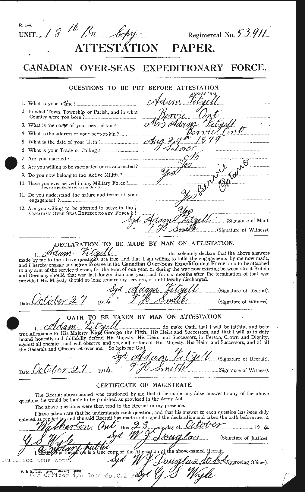 [ix] Fitzell, Levi, reg. no. 53912. His son, Adam, reg. no. 53911 also served in the 18th. They both enlisted on the same day and have consecutive regimental numbers. His son, Watson, reg. no. 402509, also served in the C.E.F. They all survived.