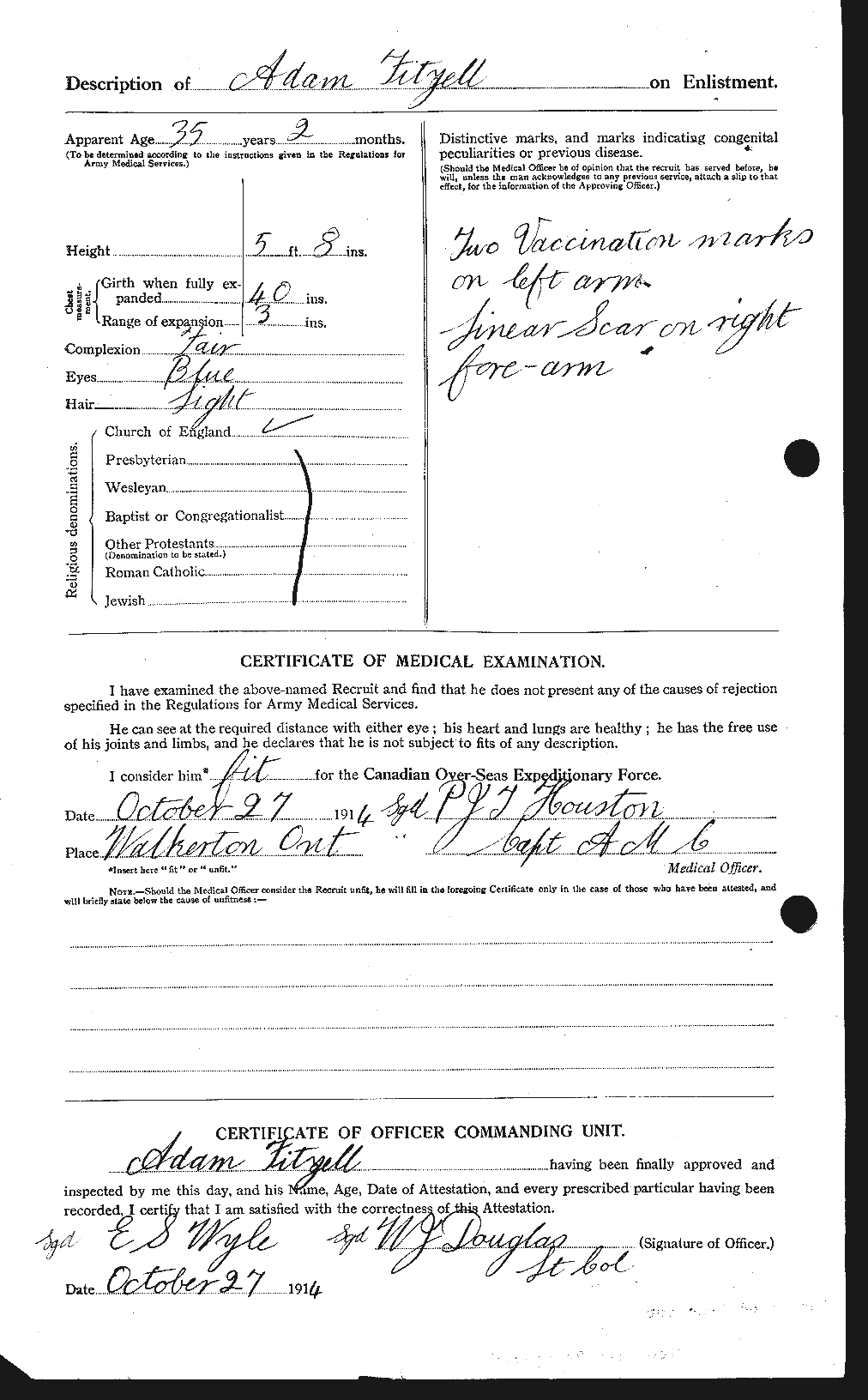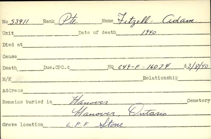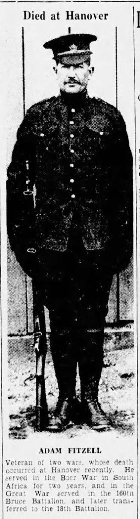 Family Search: When Private Adam Fitzell was born on 29 August 1879, in Kincardine, Bruce, Ontario, Canada, his father, Adam Fitzell, was 30 and his mother, Margaret Innes, was 20. He married Euphemia Wynn on 2 April 1924, in Bruce, Ontario, Canada. They were the parents of at least 1 son. He lived in Ontario, Canada in 1880 and Bruce, Ontario, Canada in 1911. He registered for military service in 1914. In 1914, at the age of 35, his occupation is listed as labourer in Bervie, Kincardine, Bruce, Ontario, Canada. He died on 29 April 1940, in Hanover, Grey, Ontario, Canada, at the age of 60, and was buried in Hanover Cemetery, Hanover, Grey, Ontario, Canada.