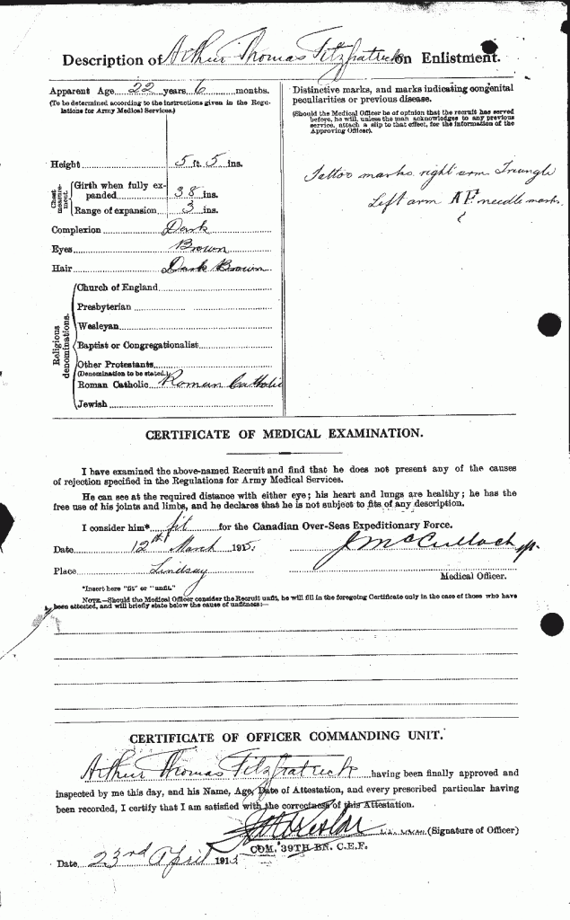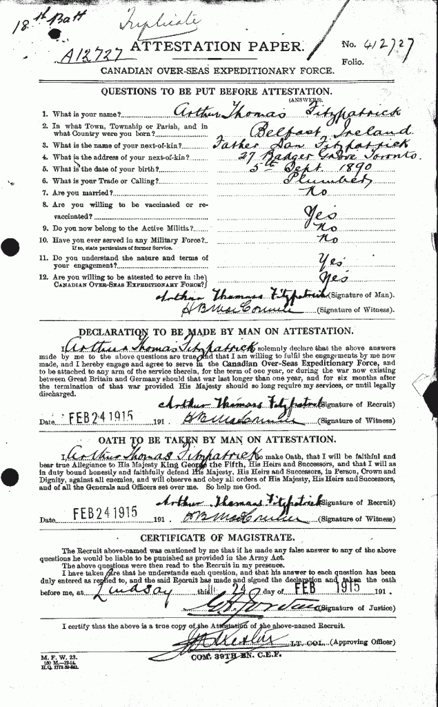 Family Search: Private Arthur Thomas Fitzpatrick was born on 5 September 1890, in Belfast, Ireland as the son of Daniel Fitzpatrick and Ellen McAllister. He married Alice Ladysmith Lane on 28 June 1924, in Fort Erie, Bertie, Welland, Ontario, Canada. He immigrated to Canada in 1913 and lived in Fort Erie, Bertie, Welland, Ontario, Canada in 1930. He registered for military service in 1915. In 1930, his occupation is listed as plumber in Fort Erie, Bertie, Welland, Ontario, Canada.