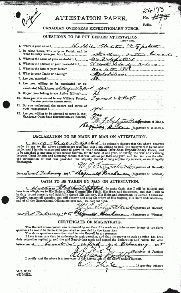 Fitzpatrick, William Gladstone: Service no. 54173 Digitized Service Record Source: 18th Battalion Nominal Roll, April 1915. Find-A-Grave London Advertiser. April 6, 1915. Page 3. Share this: Click to email a link to a friend (Opens in new window) Email Click to share on Facebook (Opens in new window) Facebook Click to share on X (Opens in new window) X Click to share on Reddit (Opens in new window) Reddit Click to share on LinkedIn (Opens in new window) LinkedIn Click to print (Opens in new window) Print Click to share on Tumblr (Opens in new window) Tumblr Click to share on Pocket (Opens in new window) Pocket Click to share on Pinterest (Opens in new window) Pinterest Click to share on Telegram (Opens in new window) Telegram Click to share on WhatsApp (Opens in new window) WhatsApp Like Loading...