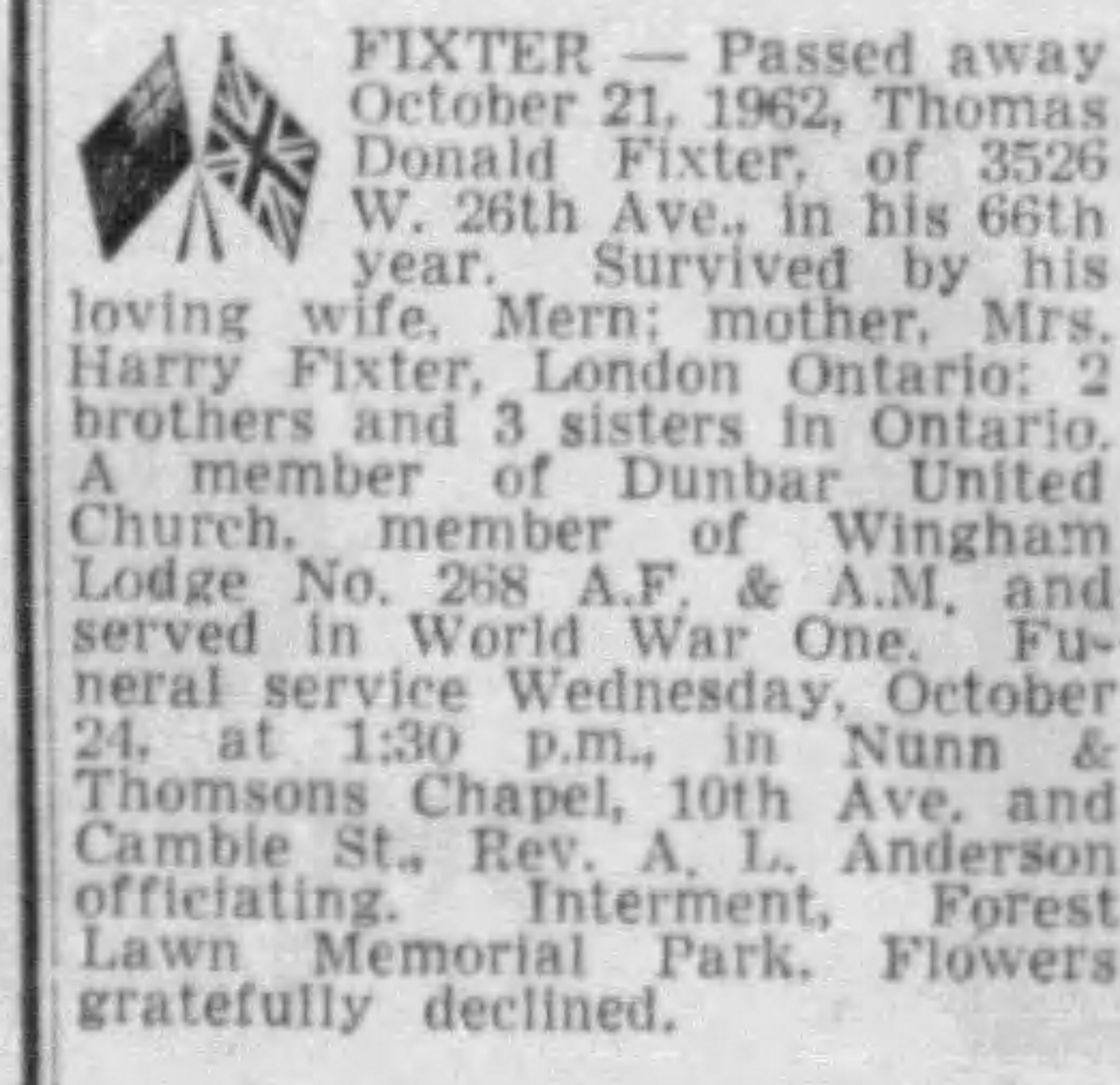 Family Search: When Sergeant Thomas Donald Fixter was born on 1 March 1897, in London, Ontario, Canada West, British Colonial America, his father, Henry Fixter, was 33 and his mother, Annie McDonald, was 22. He married Myrtle Mae Johnston on 11 May 1921, in Detroit, Wayne, Michigan, United States. He lived in Huron, Ontario, Canada for about 10 years. He registered for military service in 1916. He died on 21 October 1962, in Vancouver, British Columbia, Canada, at the age of 65, and was buried in Pacific Heritage Cemetery, Burnaby, British Columbia, Canada.