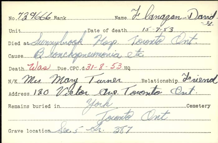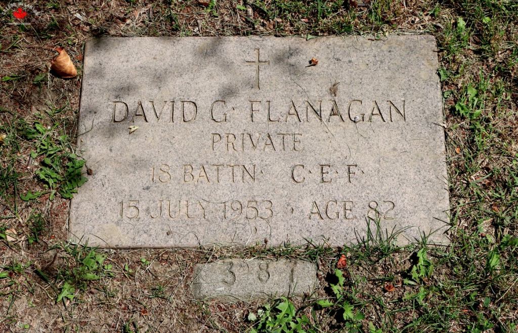 Family Search: Private David George Flanagan was born on 27 November 1870, in Bethnal Green, London, England, United Kingdom as the son of Thomas Flanagan and Mary Flanagan. He married Emily Louisa Elliott on 2 December 1896, in York, Ontario, Canada. They were the parents of at least 3 sons and 2 daughters. He immigrated to Canada in 1910 and lived in Ontario, Canada in 1911. He registered for military service in 1916. In 1916, at the age of 46, his occupation is listed as concrete construction. He died on 15 July 1953, in Toronto, York, Ontario, Canada, at the age of 82, and was buried in York Cemetery, Toronto, Ontario, Canada.