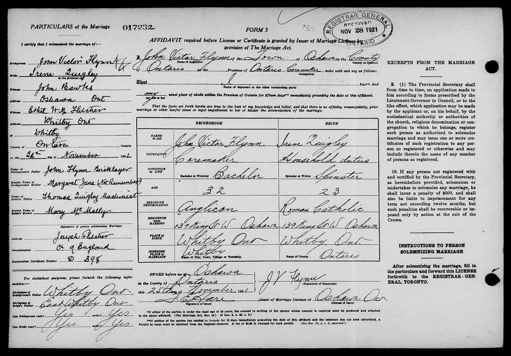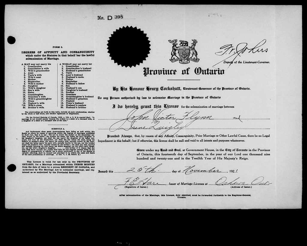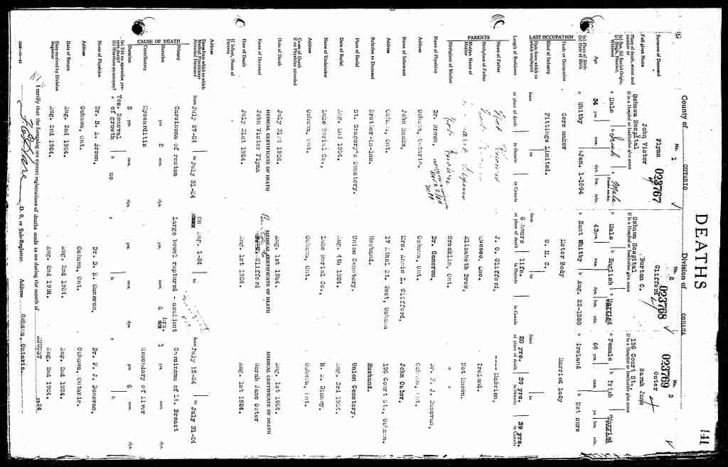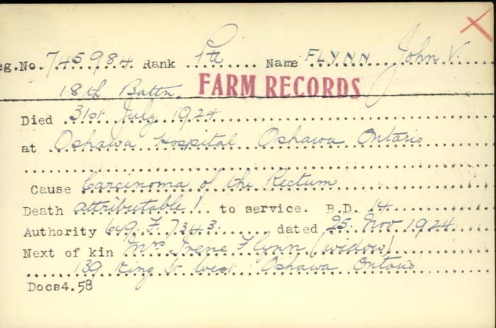 Family Search: Private John Victor Flynn was born on 1 January 1889, in Oshawa, Ontario, Ontario, Canada as the son of John Flynn and Margaret Jane. He married Agnes Irene Quigley on 25 November 1921, in Oshawa, Ontario, Ontario, Canada. He registered for military service in 1915. In 1915, at the age of 26, his occupation is listed as core maker in Oshawa, Durham, Ontario, Canada. He died on 31 July 1924, in his hometown, at the age of 35, and was buried in Saint Gregory’s Catholic Cemetery, Oshawa, Ontario, Ontario, Canada.
