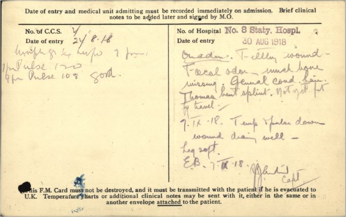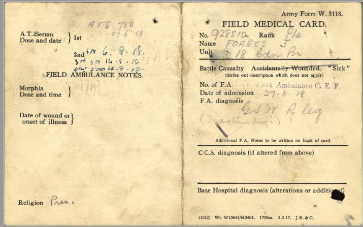 “Trade listed as Farmer. DOB 7-2-97, born Minto Township. 5 foot 8 inches. Grey eyes, brown hair. Presbyterian. NOK John Forbes, father. Enlisted Harriston 26-1-16 (age 19 years). On 153rd Nominal Roll 12-2-16, no transfer noted. On 153rd Battalion Nominal Rolls as published Guelph Mercury 10-6-16 and 1-12-16. Embarked with 153rd Halifax N.S. SS Olympic 29-4-17. Arrived Liverpool 25-7-17. Assigned 25th Reserve for Training and Administration. Taken on Strength 18th Battalion 29-3-18. GSW 27-8-18, machine gun bullet to right thigh, plus compound fracture right femur. Returned to Canada aboard SS Essequibo 17-5-19, Halifax, N.S. disability: compound fracture left femur. In Military hospitals France, England and Canada until discharged. Discharged 28-10-20 as medically unfit to take effect 30-10-20 – to take further in patient treatment under DSCR. Department of Veteran Affairs Death Notification: died 27-7-71, Scarborough General Hospital, Toronto.