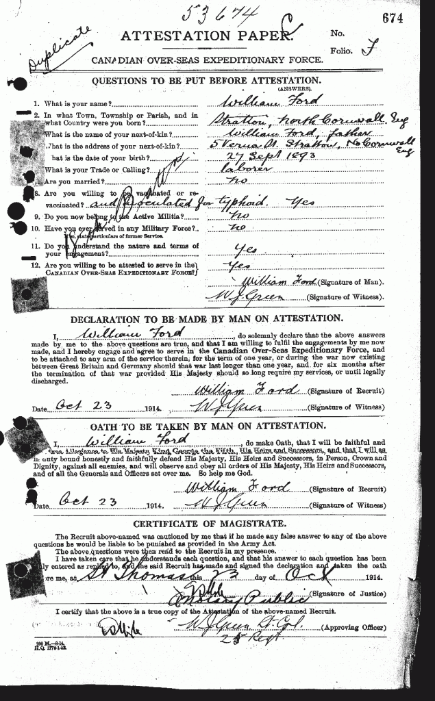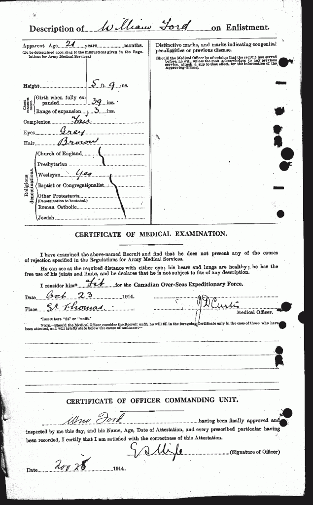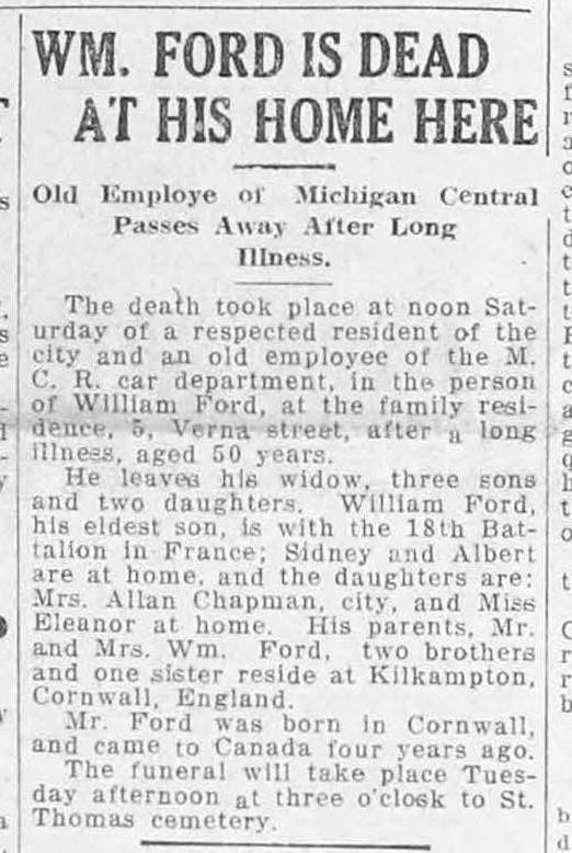 Family Search: When Private William T. Ford was born on 27 September 1893, in Stratton, Cornwall, England, United Kingdom, his father, William Cornish Ford, was 28 and his mother, Emily Venner, was 19. He lived in Bude, Cornwall, England, United Kingdom in 1911. He died on 6 January 1919, in St. Thomas, Ontario, Canada, at the age of 25, and was buried in St. Thomas, Ontario, Canada.