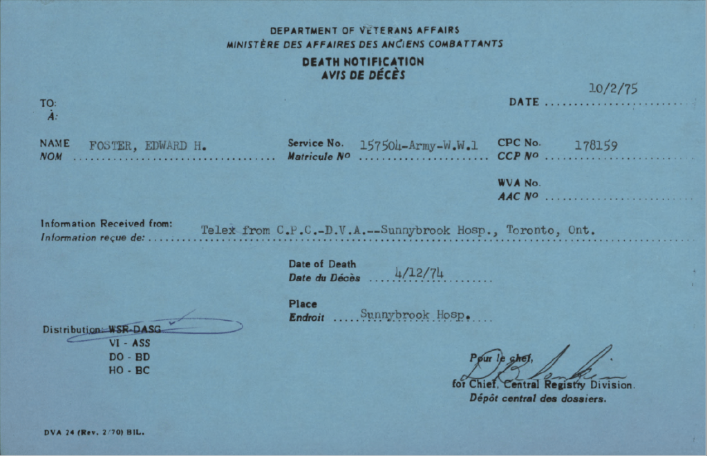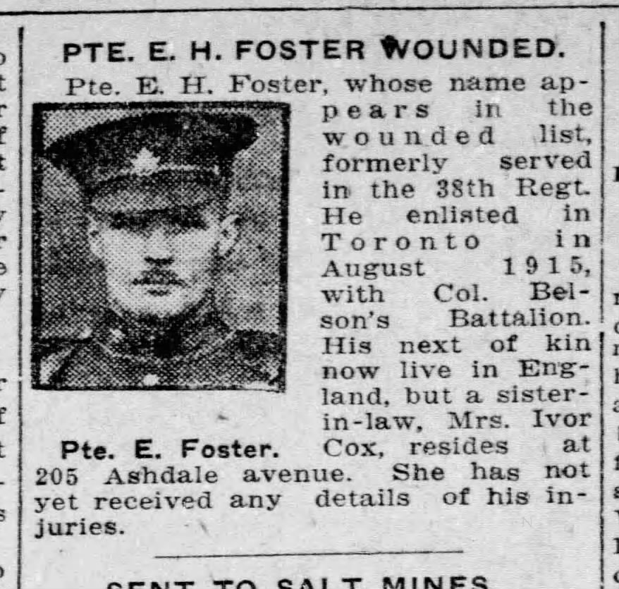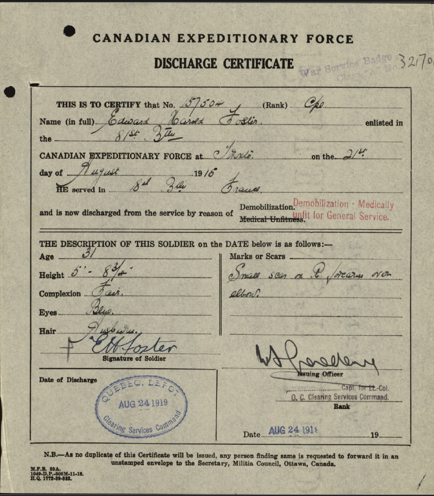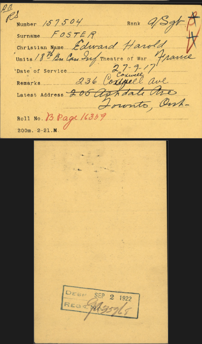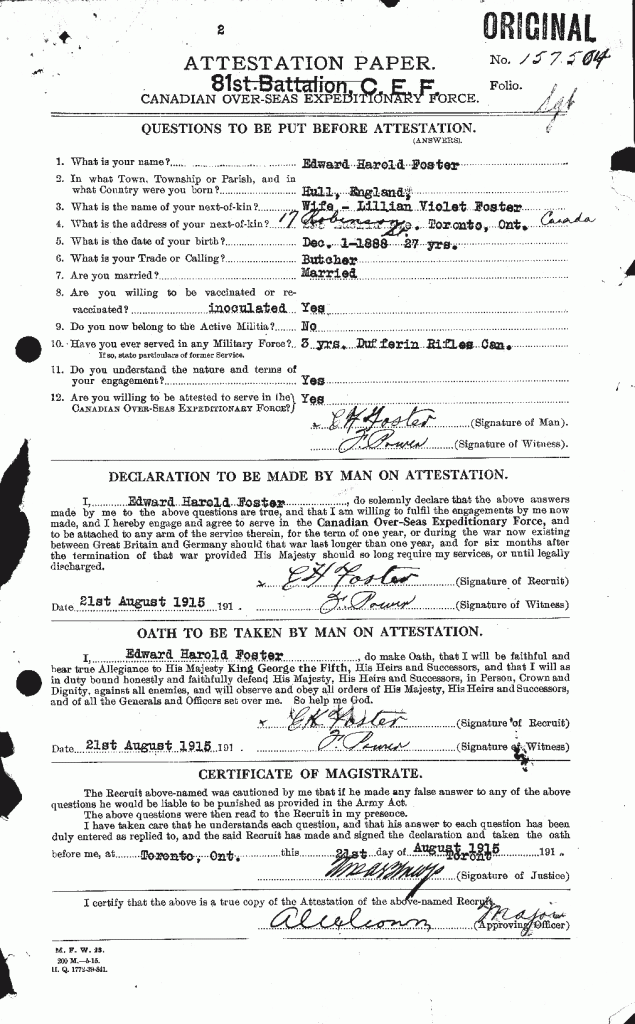 Family Search: Private Edward Harold Foster was born on 1 December 1886, in Hull, Yorkshire East Riding, England, United Kingdom as the son of John James Foster and Sarah Brumey. He married Lillian Violet Priscilla Cox on 9 August 1915, in Toronto, York, Ontario, Canada. They were the parents of at least 2 sons and 1 daughter. He immigrated to Quebec City, Quebec, Canada in 1910 and lived in Toronto, York, Ontario, Canada for about 7 years. He registered for military service in 1915. In 1915, at the age of 29, his occupation is listed as butcher in Toronto, York, Ontario, Canada. He died on 4 December 1972, in Toronto, Ontario, Canada, at the age of 86, and was buried in Resthaven Memorial Gardens, Scarborough, Toronto, Ontario, Canada.