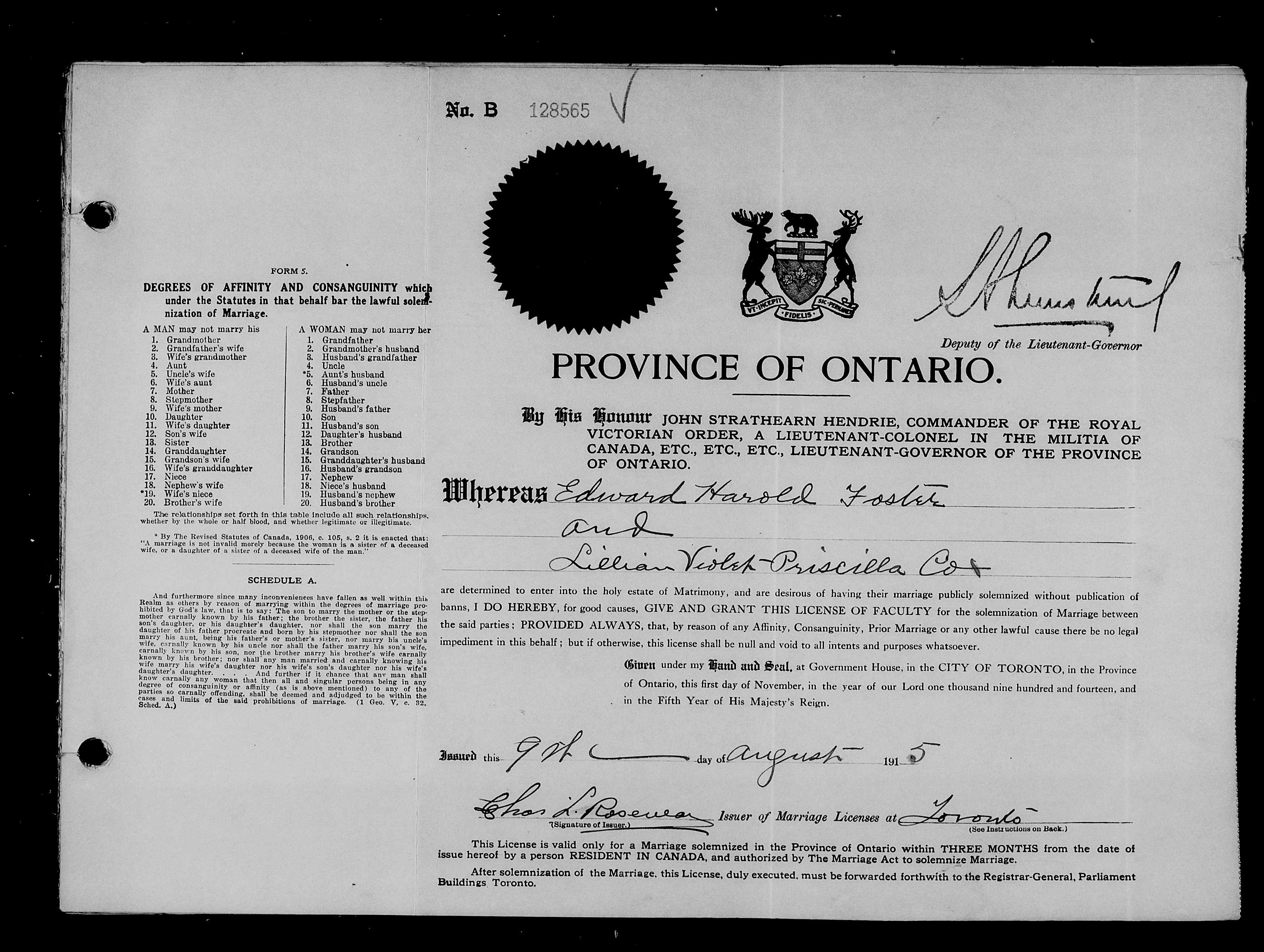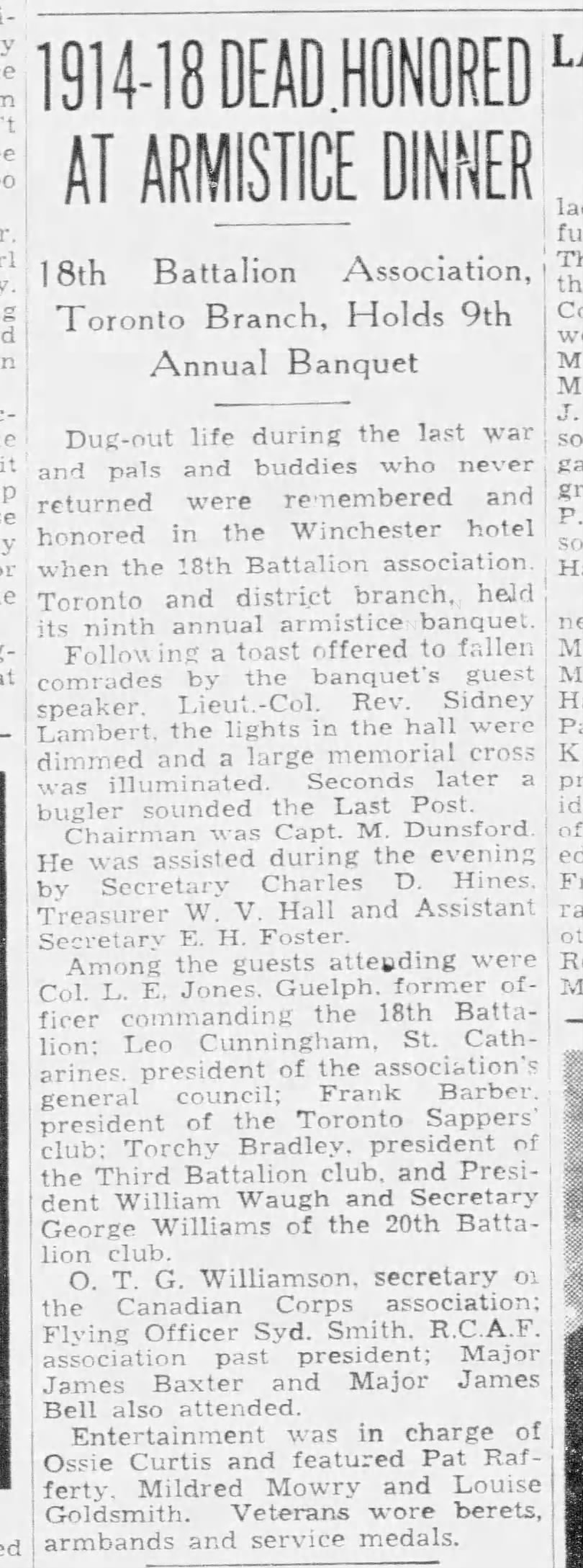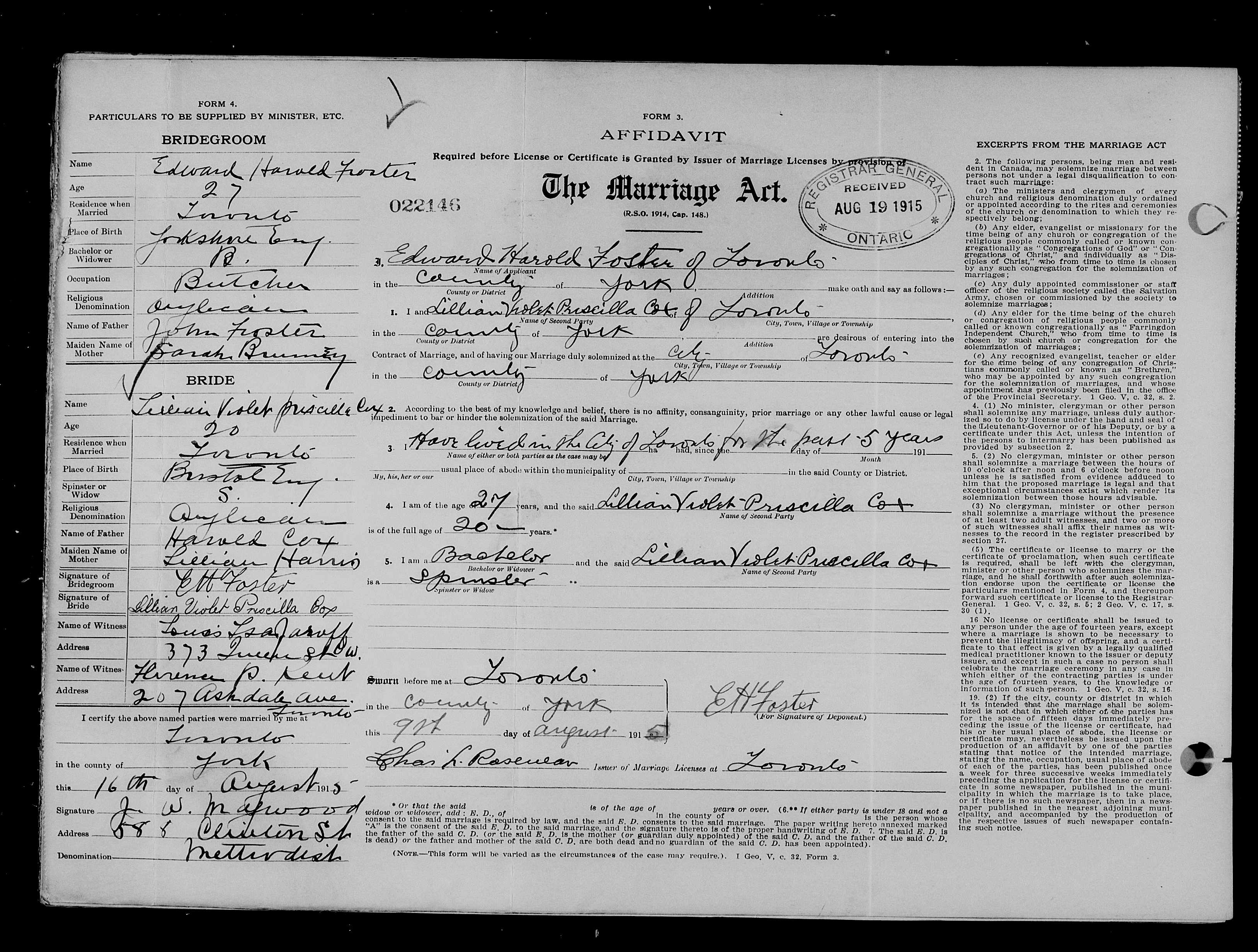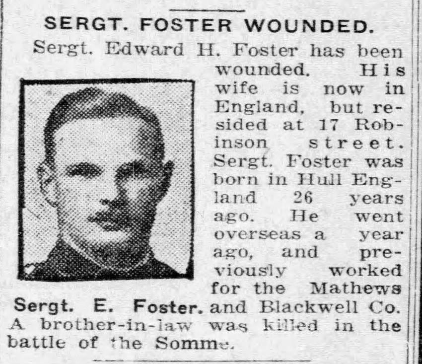 Family Search: Private Edward Harold Foster was born on 1 December 1886, in Hull, Yorkshire East Riding, England, United Kingdom as the son of John James Foster and Sarah Brumey. He married Lillian Violet Priscilla Cox on 9 August 1915, in Toronto, York, Ontario, Canada. They were the parents of at least 2 sons and 1 daughter. He immigrated to Quebec City, Quebec, Canada in 1910 and lived in Toronto, York, Ontario, Canada for about 7 years. He registered for military service in 1915. In 1915, at the age of 29, his occupation is listed as butcher in Toronto, York, Ontario, Canada. He died on 4 December 1972, in Toronto, Ontario, Canada, at the age of 86, and was buried in Resthaven Memorial Gardens, Scarborough, Toronto, Ontario, Canada.