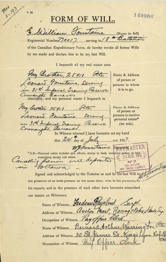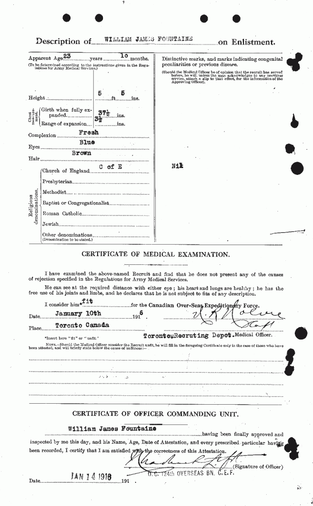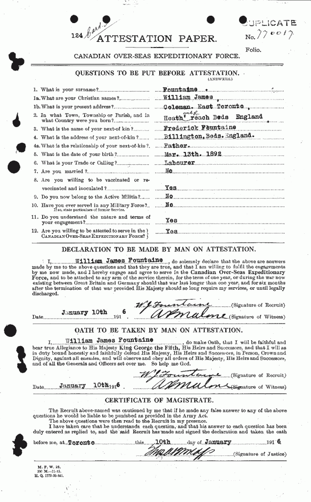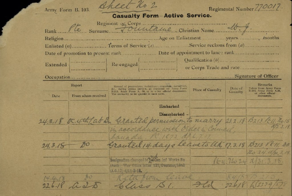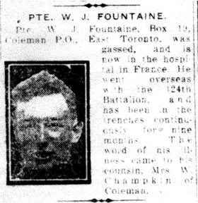 Fountaine, William James: Service no. 770017 Digitized Service Record Source: Per news clipping post by David Archer at 18th Battalion Facebook Page (not group). Find-A-Grave Fountaine, William James: Service no. 770017. Source: Toronto Telegram. May 1917. Per news clipping post by David Archer at 18th Battalion Facebook Page (not group). Share this: Click to email a link to a friend (Opens in new window) Email Click to share on Facebook (Opens in new window) Facebook Click to share on X (Opens in new window) X Click to share on Reddit (Opens in new window) Reddit Click to share on LinkedIn (Opens in new window) LinkedIn Click to print (Opens in new window) Print Click to share on Tumblr (Opens in new window) Tumblr Click to share on Pocket (Opens in new window) Pocket Click to share on Pinterest (Opens in new window) Pinterest Click to share on Telegram (Opens in new window) Telegram Click to share on WhatsApp (Opens in new window) WhatsApp Like Loading...