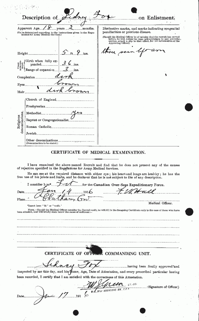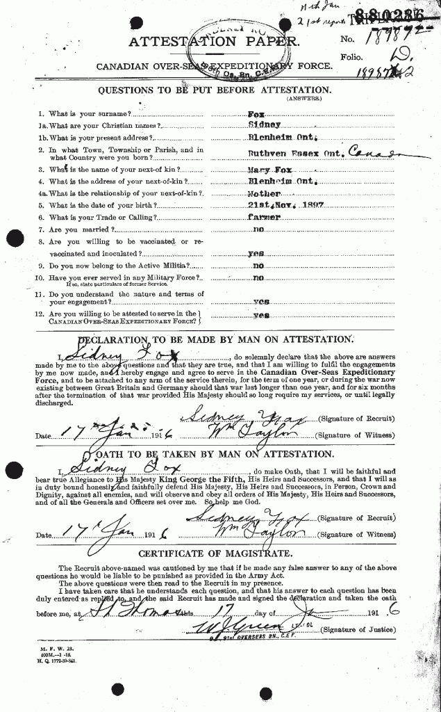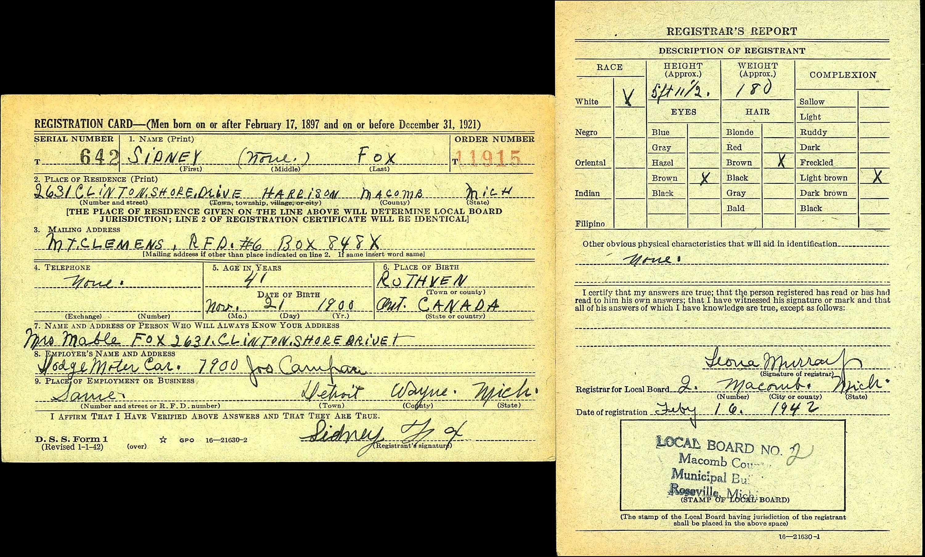 Family Search: When Private Sidney Fox was born on 21 November 1900, in Ruthven, Kingsville, Essex, Ontario, Canada, his father, Michael Fox, was 24 and his mother, Mary Jane Noble, was 22. He married Mabel Anna Kurzhals on 29 July 1925, in Detroit, Wayne, Michigan, United States. He lived in Mount Clemens, Macomb, Michigan, United States in 1950 and Harrison Township, Macomb, Michigan, United States in 1950. He registered for military service in 1916. In 1916, at the age of 16, his occupation is listed as farmer in Blenheim, Kent, Ontario, Canada. He died on 1 August 1952, in Saint Clair Shores, Macomb, Michigan, United States, at the age of 51.