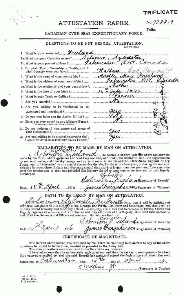 Family Search: When Solomon Sylvester Freeland was born on 14 July 1890, in Wallace, Perth, Ontario, Canada, his father, James Alexander Freeland, was 42 and his mother, Ellen Adella May, was 29. He lived in Perth, Ontario, Canada in 1911 and Palmerston, Perth, Ontario, Canada in 1916. He registered for military service in 1916. In 1916, at the age of 26, his occupation is listed as farmer in Palmerston, Perth, Ontario, Canada. He died in 1977, in Palmerston, Minto, Wellington, Ontario, Canada, at the age of 87