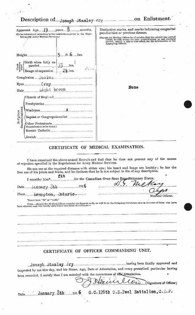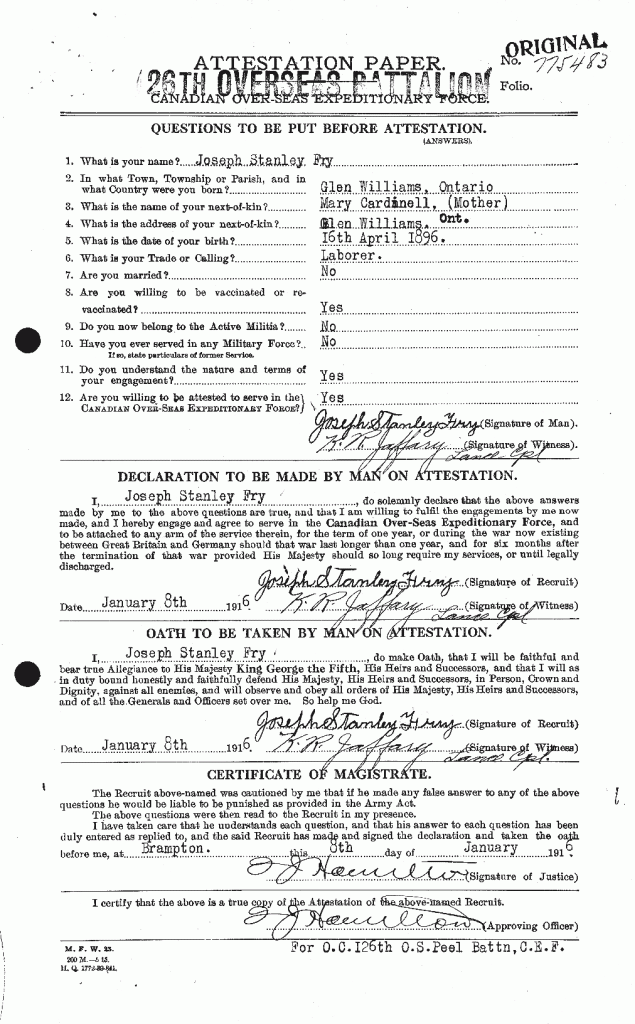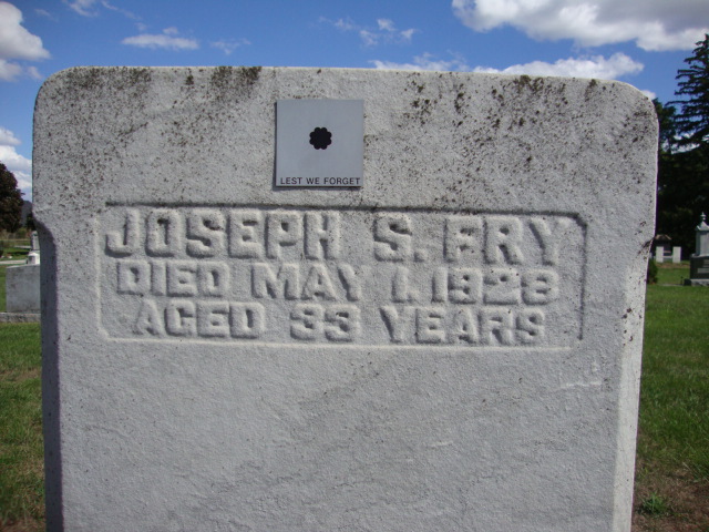 Family Search: When Joseph Stanley Fry was born on 16 April 1895, in Glen Williams, Halton, Ontario, Canada, his father, Walter Alfred Fry, was 50 and his mother, Mary Ann Hunter, was 33. He had at least 2 daughters with Mae Brennan. He lived in Ontario, Canada in 1895. He registered for military service in 1916. In 1916, at the age of 21, his occupation is listed as labourer in Glen Williams, Halton, Ontario, Canada. He died on 1 May 1928, in Halton, Ontario, Canada, at the age of 33, and was buried in Glen Williams, Halton, Ontario, Canada.