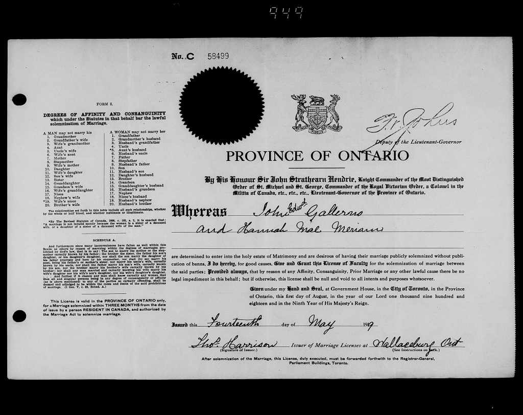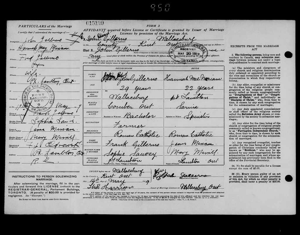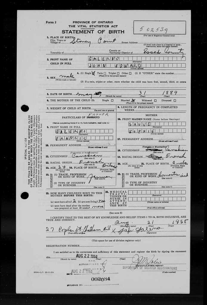 Family Search: When Private John Edward Gallerno was born on 31 May 1889, in Tilbury, Kent, Ontario, Canada, his father, Joseph François Galarneau, was 33 and his mother, Marie Sophie Sauvé, was 22. He married Hannah May Meriam on 14 May 1919, in Ontario, Ontario, Canada. They were the parents of at least 3 sons and 1 daughter. He lived in Raleigh, Kent, Ontario, Canada in 1931 and Chatham, Kent, Ontario, Canada in 1982. He registered for military service in 1916. In 1916, at the age of 27, his occupation is listed as labourer. He died on 9 June 1982, in London, Ontario, Canada, at the age of 93, and was buried in Saint Anthonys Roman Catholic Cemetery, Chatham, Chatham-Kent, Ontario, Canada.