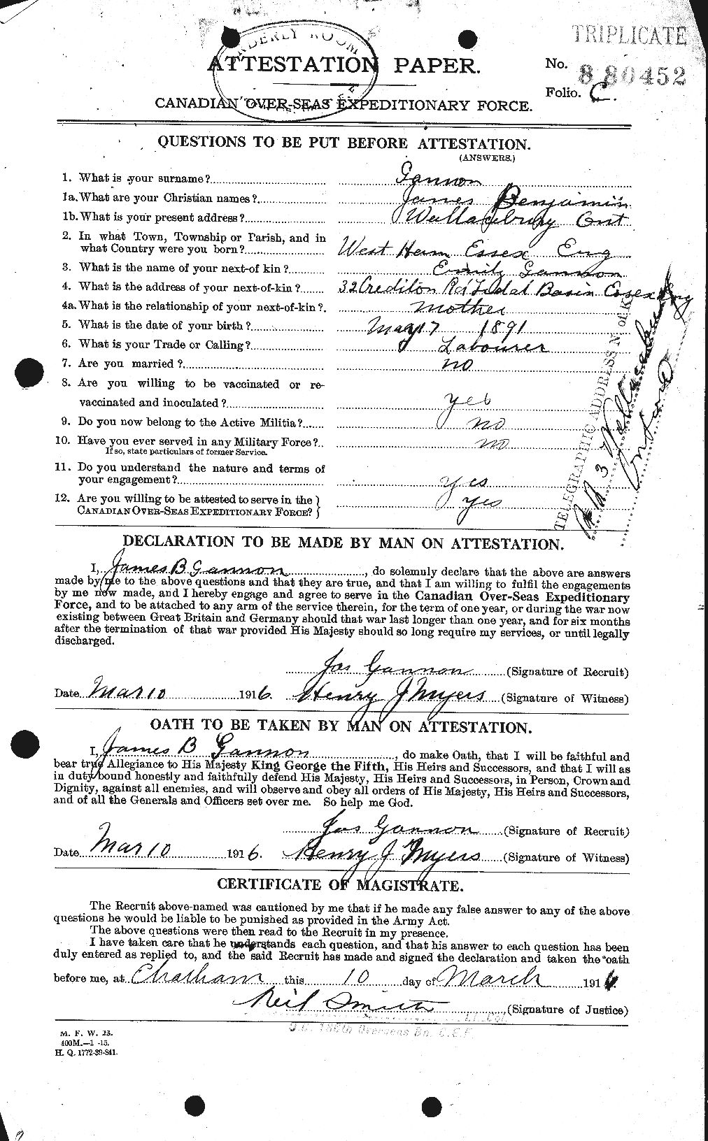 Gannon, James Benjamin: Service no. 880452 Digitized Service Record Source: Per post at 18th Battalion Facebook Group by Allan Miller. Gathering Our Heroes Find-A-Grave Gannon, James Benjamin: Service no. 880452. Via Gathering Our Heroes. Share this: Click to email a link to a friend (Opens in new window) Email Click to share on Facebook (Opens in new window) Facebook Click to share on X (Opens in new window) X Click to share on Reddit (Opens in new window) Reddit Click to share on LinkedIn (Opens in new window) LinkedIn Click to print (Opens in new window) Print Click to share on Tumblr (Opens in new window) Tumblr Click to share on Pocket (Opens in new window) Pocket Click to share on Pinterest (Opens in new window) Pinterest Click to share on Telegram (Opens in new window) Telegram Click to share on WhatsApp (Opens in new window) WhatsApp Like Loading...