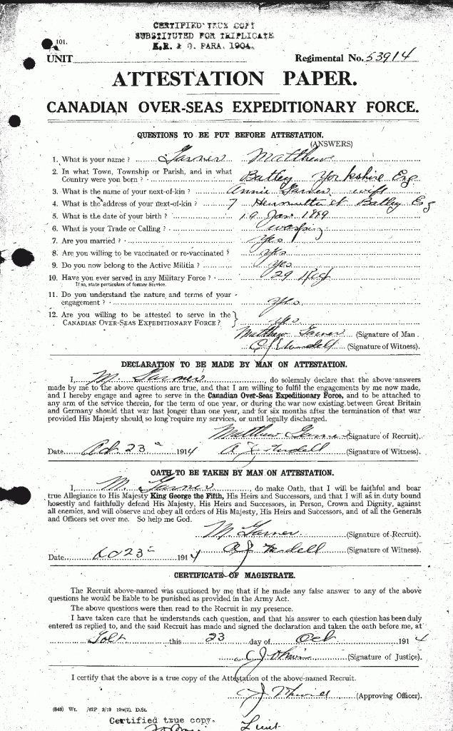 Born in Yorkshire, England. Served in World War I with Canadian Armed Forces, 29th Regiment.