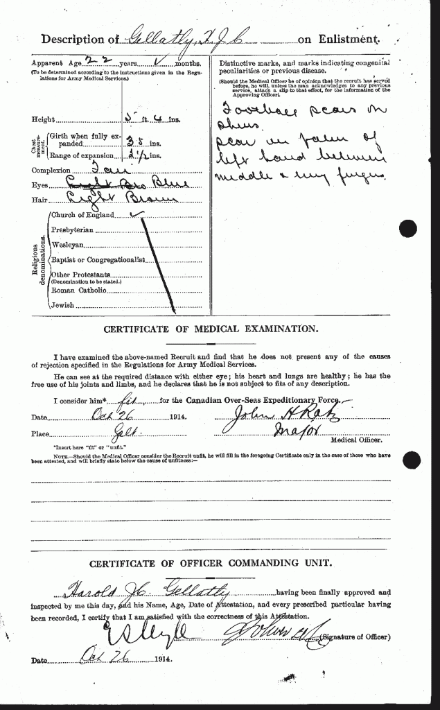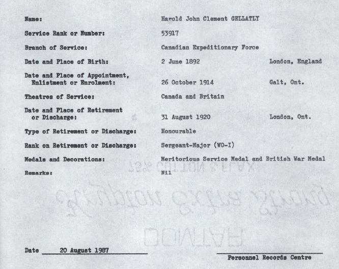 Family Search: When Sergeant Harold John Clement Gellatly was born on 2 June 1892, in Herne Hill, Surrey, England, United Kingdom, his father, William Frederick Gellatly, was 28 and his mother, Edith Agnes Sparrowe, was 29. He married Pearl Irene Eagle in 1916, in Camberwell, London, England, United Kingdom. They were the parents of at least 3 sons and 4 daughters. He lived in Camberwell, London, England, United Kingdom for about 10 years. He registered for military service in 1914. In 1914, at the age of 22, his occupation is listed as shoemaker. He died on 19 September 1979, in Kitchener, Waterloo, Ontario, Canada, at the age of 87, and was buried in Woodland Cemetery, Kitchener, Waterloo, Ontario, Canada.