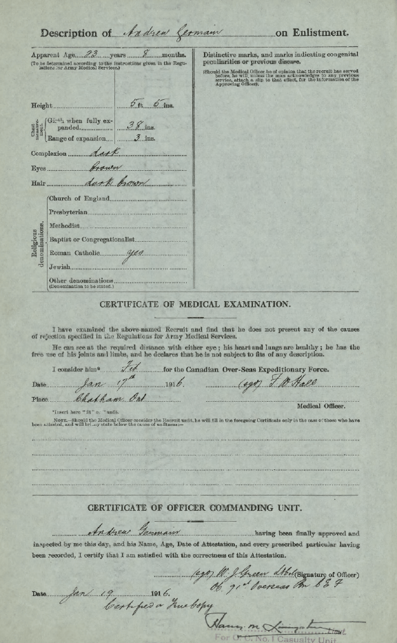 Family Search: When Private Andrew Germain was born on 28 April 1889, in Eganville, Grattan Township, Renfrew, Ontario, Canada, his father, Andrew Germain, was 42 and his mother, Felicite Gauthier, was 34. He lived in Nipissing, Ontario, Canada in 1901 and London, Ontario, Canada for about 3 years. He registered for military service in 1916. In 1923, at the age of 34, his occupation is listed as machinist in London, Ontario, Canada