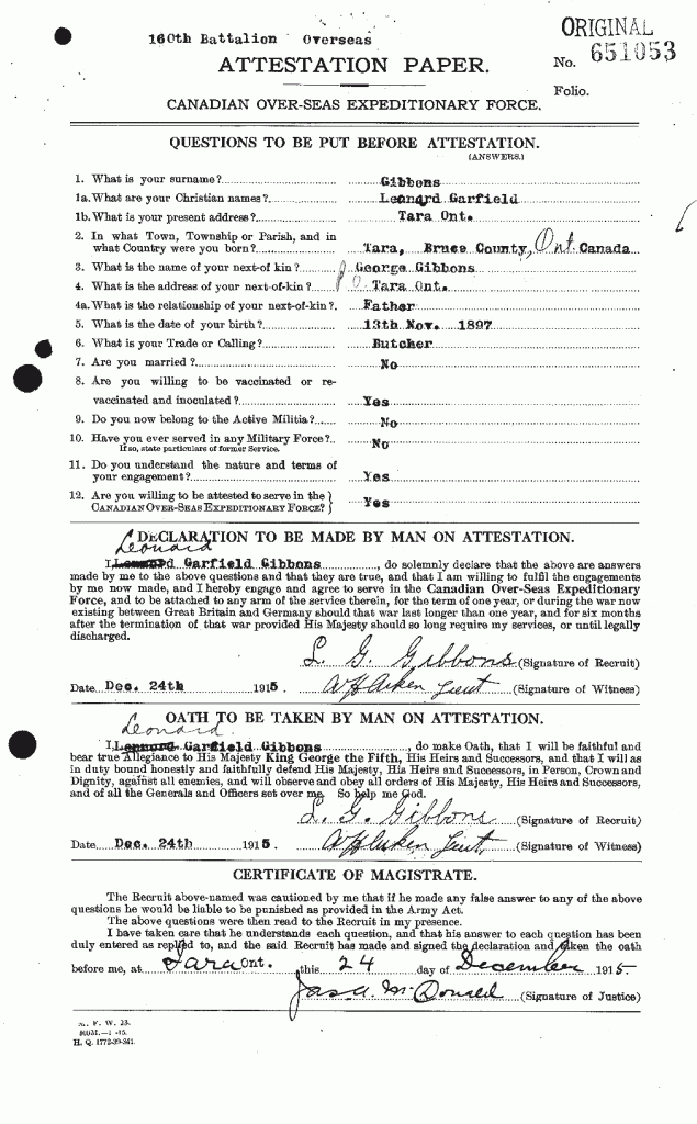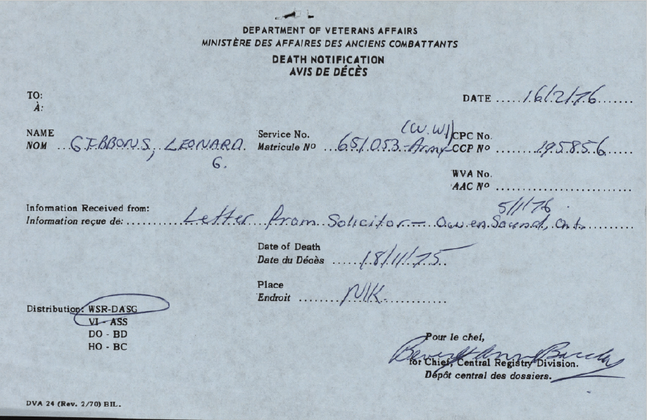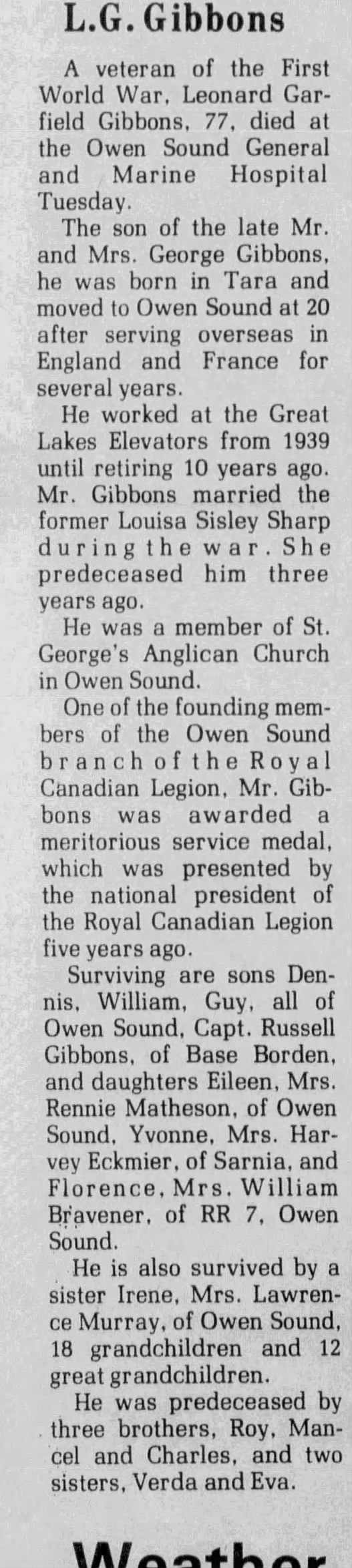 Family Search: Private Leonard Garfield Gibbons was born on 3 November 1898, in Tara, Bruce, Ontario, Canada as the son of George Gibbons and Mary Matilda Gray. He married Louisa Sisley Sharp on 9 June 1919, in Tooting, London, England, United Kingdom. They were the parents of at least 4 sons and 3 daughters. He immigrated to Quebec City, Quebec, Canada in 1920. He registered for military service in 1915. He died on 18 November 1975, in Owen Sound, Grey, Ontario, Canada, at the age of 77, and was buried in Hillcrest Cemetery, Tara, Bruce, Ontario, Canada.