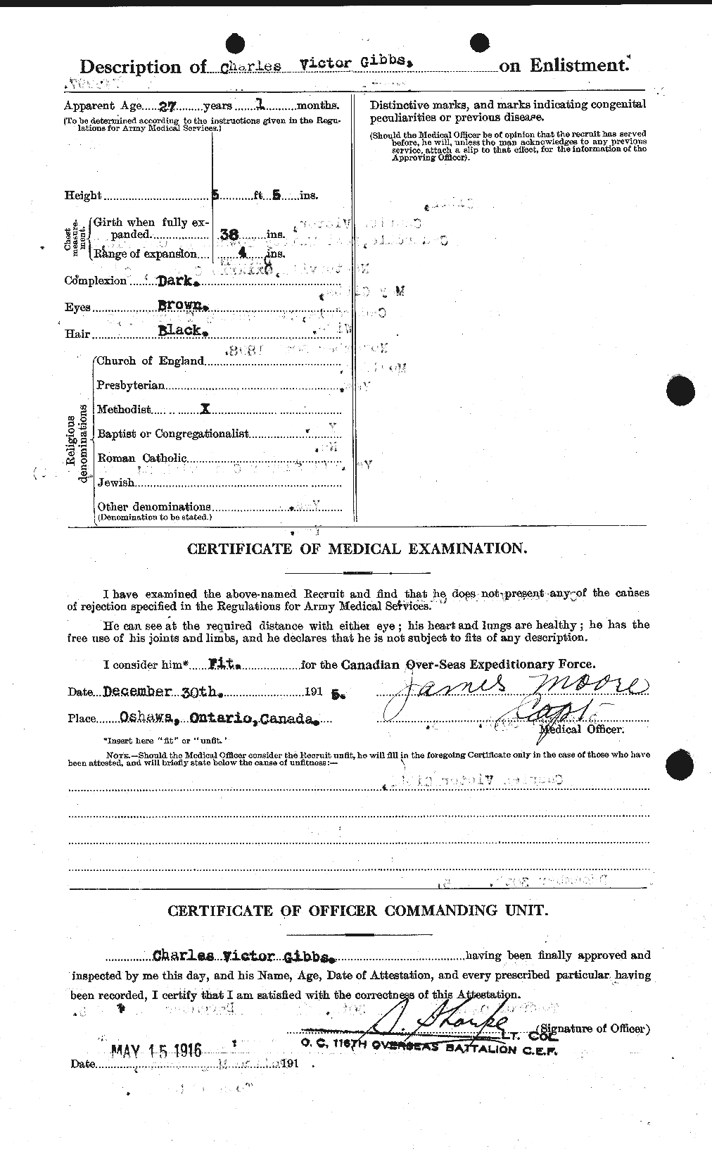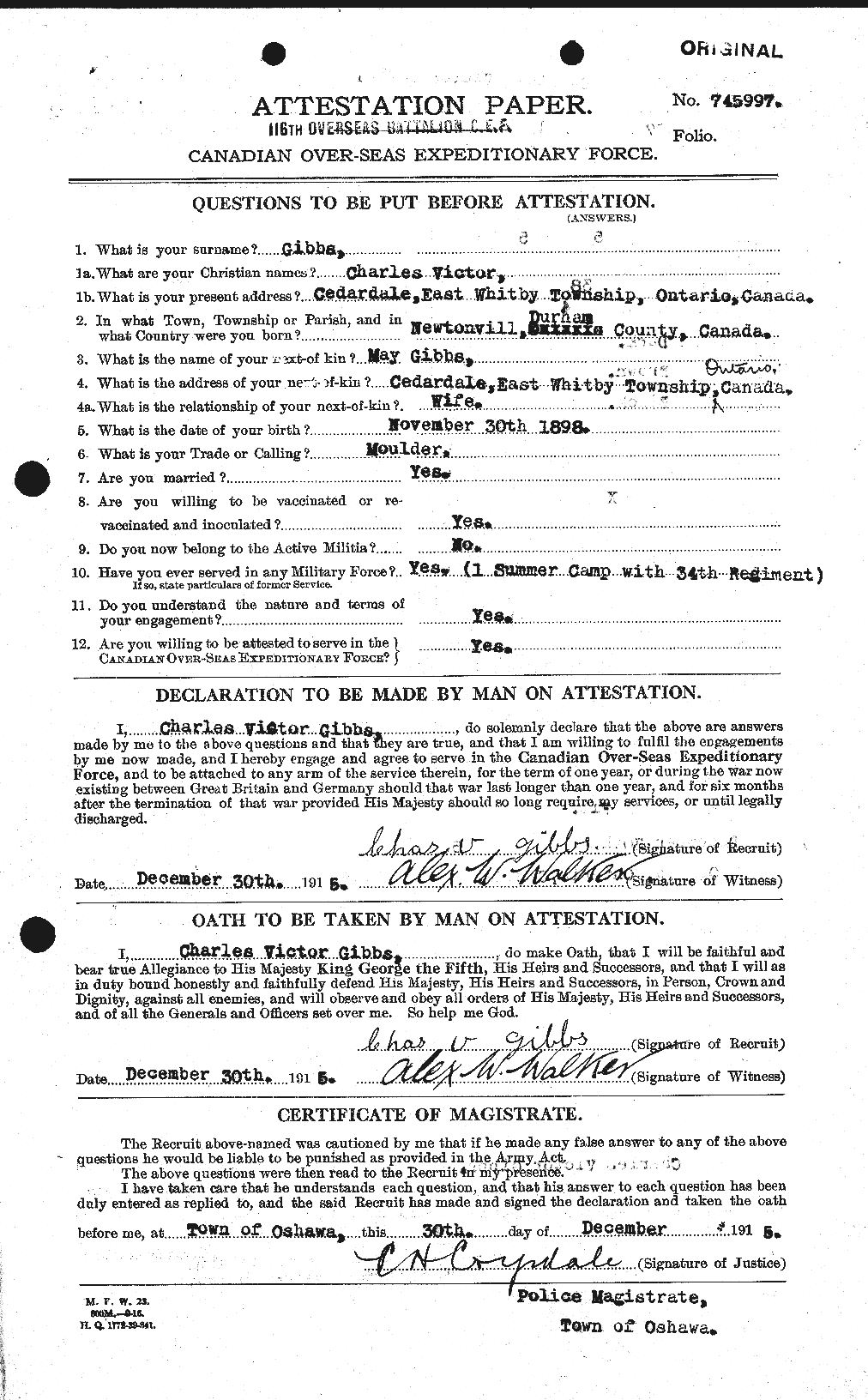 Family Search: When Charles Victor Gibbs was born on 30 November 1889, in Clarke, Durham, Ontario, Canada, his father, Richard James Gibbs, was 34 and his mother, Agnes Botley, was 33. He married Marie Benest on 31 August 1910, in Niagara, New York, United States. He lived in Ontario, Canada in 1889 and Ontario, Ontario, Canada for about 10 years. He died on 18 February 1970, in Oshawa, Ontario, Ontario, Canada, at the age of 80, and was buried in Mount Lawn Memorial Park, Oshawa, Ontario, Ontario, Canada.