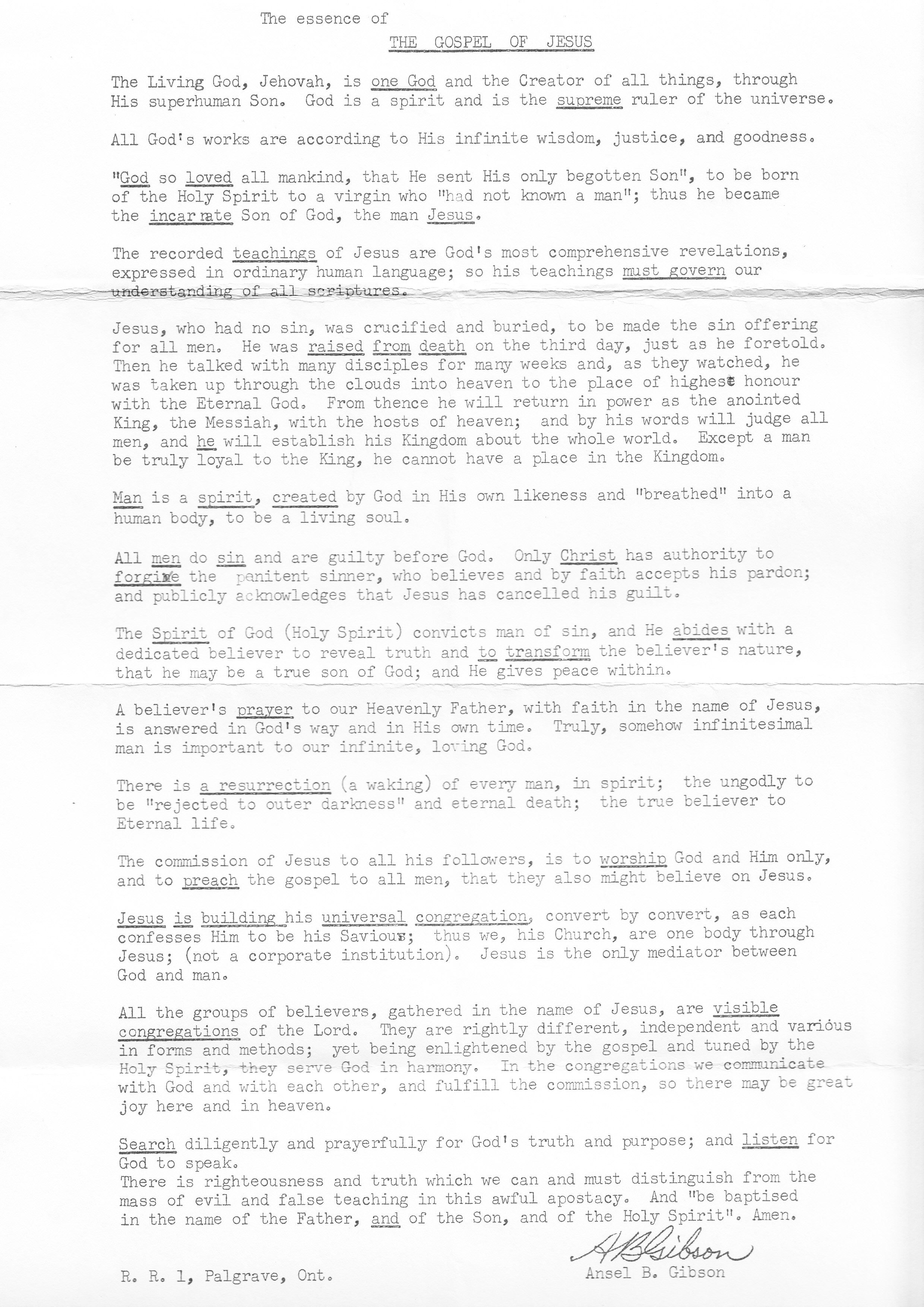 The last time I saw Mr. Gibson was during the 2nd of 3 visits to Mr. Gibson’s property north of Palgrave. This was in 1969. I was doing a high school project. He offered me this summary titled, “The essence of The Gospel Of Jesus” which I was happy to accept. He had obviously studied and thought hard on the subject.