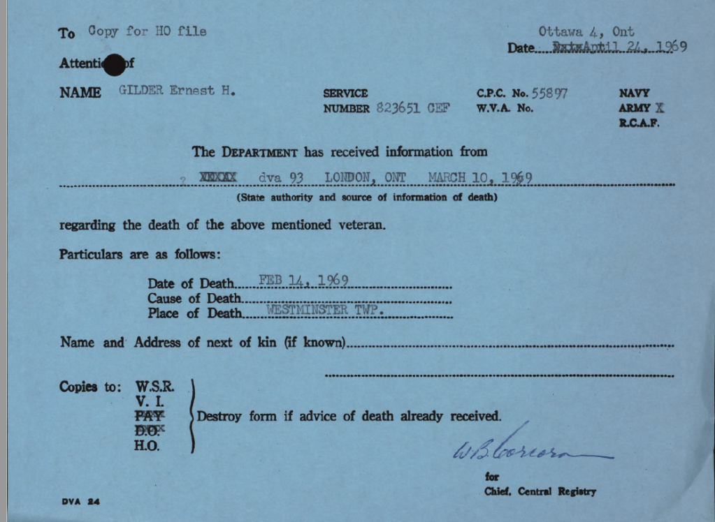 Family Search: When Ernest Henry Gilder was born on 25 May 1886, in Maidenhead, Berkshire, England, United Kingdom, his father, Thomas Gilder, was 31 and his mother, Sarah Clarke, was 31. He married Nellie Maud Keats on 30 April 1911, in England, United Kingdom. They were the parents of at least 1 daughter. He lived in London, Ontario, Canada in 1916. He registered for military service in 1916. In 1916, at the age of 30, his occupation is listed as brewery worker in London, Ontario, Canada. He died on 14 February 1969, in Westminster, Middlesex, Ontario, Canada, at the age of 82, and was buried in Mount Pleasant Cemetery, West McGillivray, North Middlesex, Middlesex, Ontario, Canada.