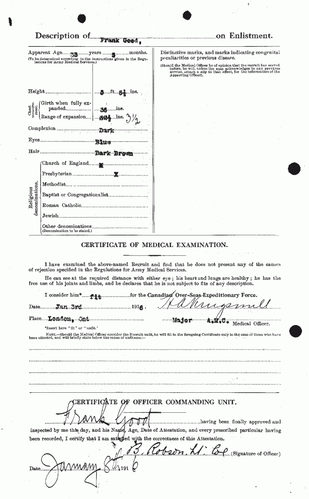 Family Search: When Frank Good was born on 3 August 1882, in London, Ontario, Canada, his father, John Arthur Good, was 40 and his mother, Mary Ann Alexander, was 35. He married Florence Rachael Stannard on 11 September 1912, in Dorchester, Thames Centre, Middlesex, Ontario, Canada. They were the parents of at least 1 son and 3 daughters. He registered for military service in 1916. In 1915, at the age of 33, his occupation is listed as machinist hand in London, Ontario, Canada. He died on 25 November 1950, in London, Ontario, Canada, at the age of 68, and was buried in Woodland Cemetery, London, Ontario, Canada.