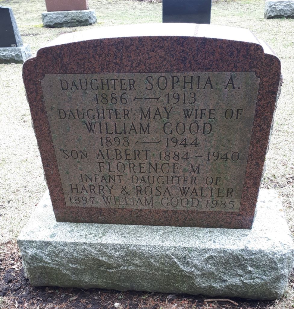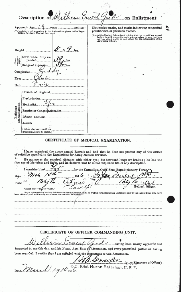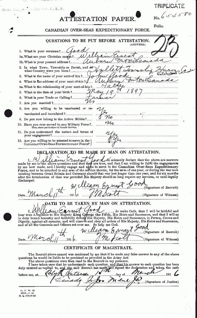 Family Search: When Private William Ernest Good was born on 19 May 1897, in Hullett Township, Huron, Ontario, Canada, his father, John James Good, was 29 and his mother, Margaret Leach, was 31. He married Emily May Walters on 23 September 1925, in Goderich, Huron, Ontario, Canada. They were the parents of at least 5 sons. He lived in West Wawanosh Township, Huron, Ontario, Canada in 1920 and Colborne Township, Huron, Ontario, Canada in 1931. He registered for military service in 1916. In 1916, at the age of 19, his occupation is listed as farmer. He died on 13 February 1985, in Lucknow, Bruce, Ontario, Canada, at the age of 87, and was buried in Colborne Cemetery, Colborne Township, Huron, Ontario, Canada.