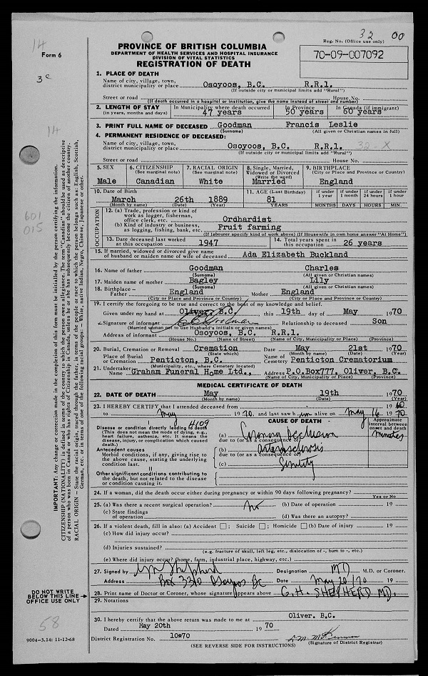 Family Search: When Lieutenant Francis Leslie Goodman was born on 26 March 1889, in London, England, United Kingdom, his father, Charles Goodman, was 28 and his mother, Lily Bagley, was 21. He married Ada Elizabeth Buckland on 10 June 1922, in Guelph, Wellington, Ontario, Canada. They were the parents of at least 1 son. He immigrated to Quebec City, Quebec, Canada in 1913 and lived in Prittlewell, Essex, England, United Kingdom in 1901 and Osoyoos, British Columbia, Canada in 1922. He registered for military service in 1916. In 1916, at the age of 27, his occupation is listed as agricultural specialist in Hamilton, Wentworth, Ontario, Canada. He died on 19 May 1970, in Osoyoos, Okanagan-Similkameen, British Columbia, Canada, at the age of 81.
