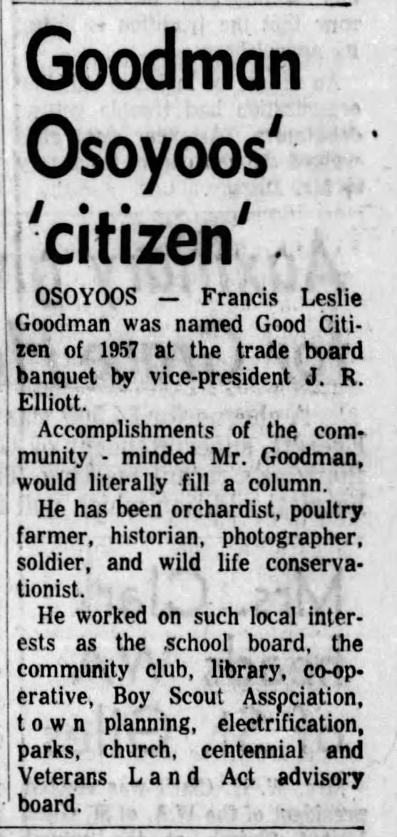 F. L. (Les) Goodman was born in England and married Daisy Buckland from Guelph, Ontario. They settled in Osoyoos in 1922. Mr. Goodman, working with the Department of Agriculture in the Fraser Valley, had bought thirty acres in Osoyoos and planted fruit trees. For fifteen years the Goodmans farmed without the benefit of electricity. Power was eventually brought to the valley in 1938, largely due to the Dividend Mine and the persistence of Les. He also strove, on several occasions, to maintain Haynes Point as a public park site.