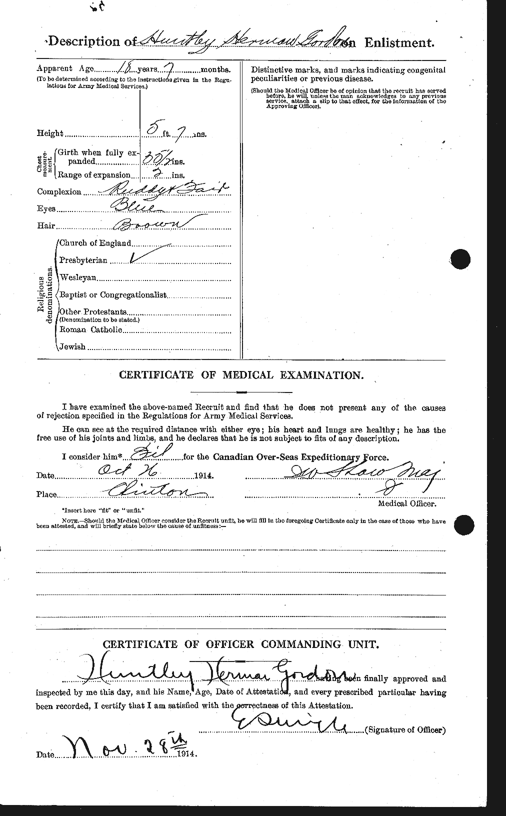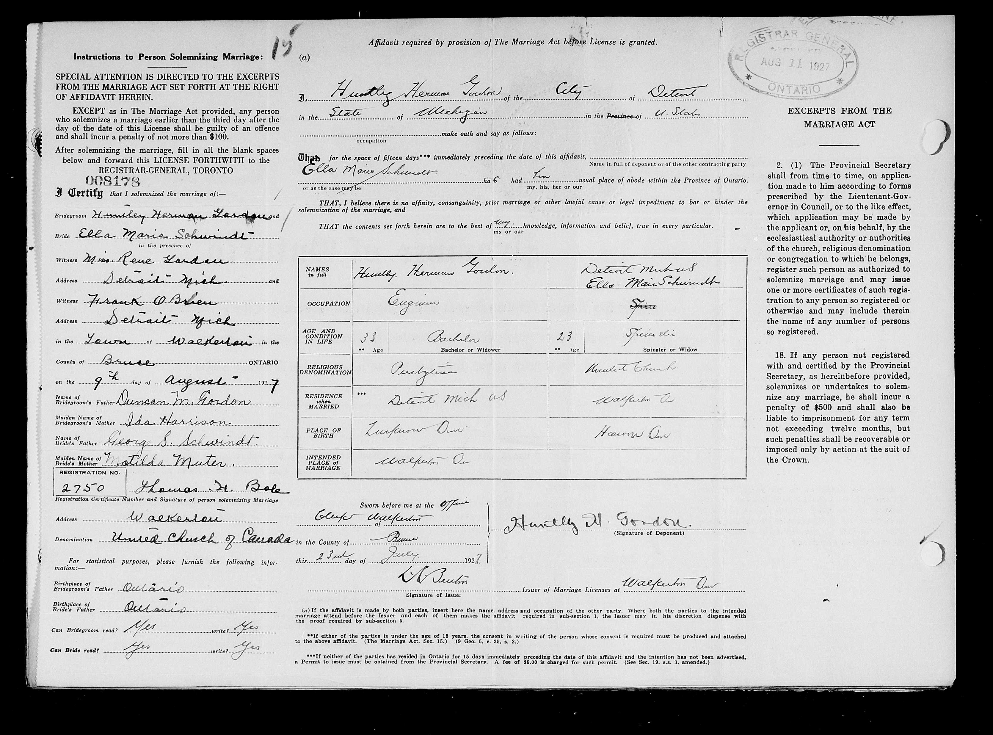 008178/27 Huntley Herman GORDON, 33, engineer, Lucknow Ont., Detroit, s/o Duncan M. GORDON (b. Ontario) & Ida HARRISON, married Ella Marie SCHWINDT, 23, Hanover Ont., Walkerton Ont., d/o George S. SCHWINDT (b. Ontario) & Matilda MUTER, witn: Miss Rene GORDON & Frank O’BRIAN both of Detroit, 9 August 1927, Walkerton.