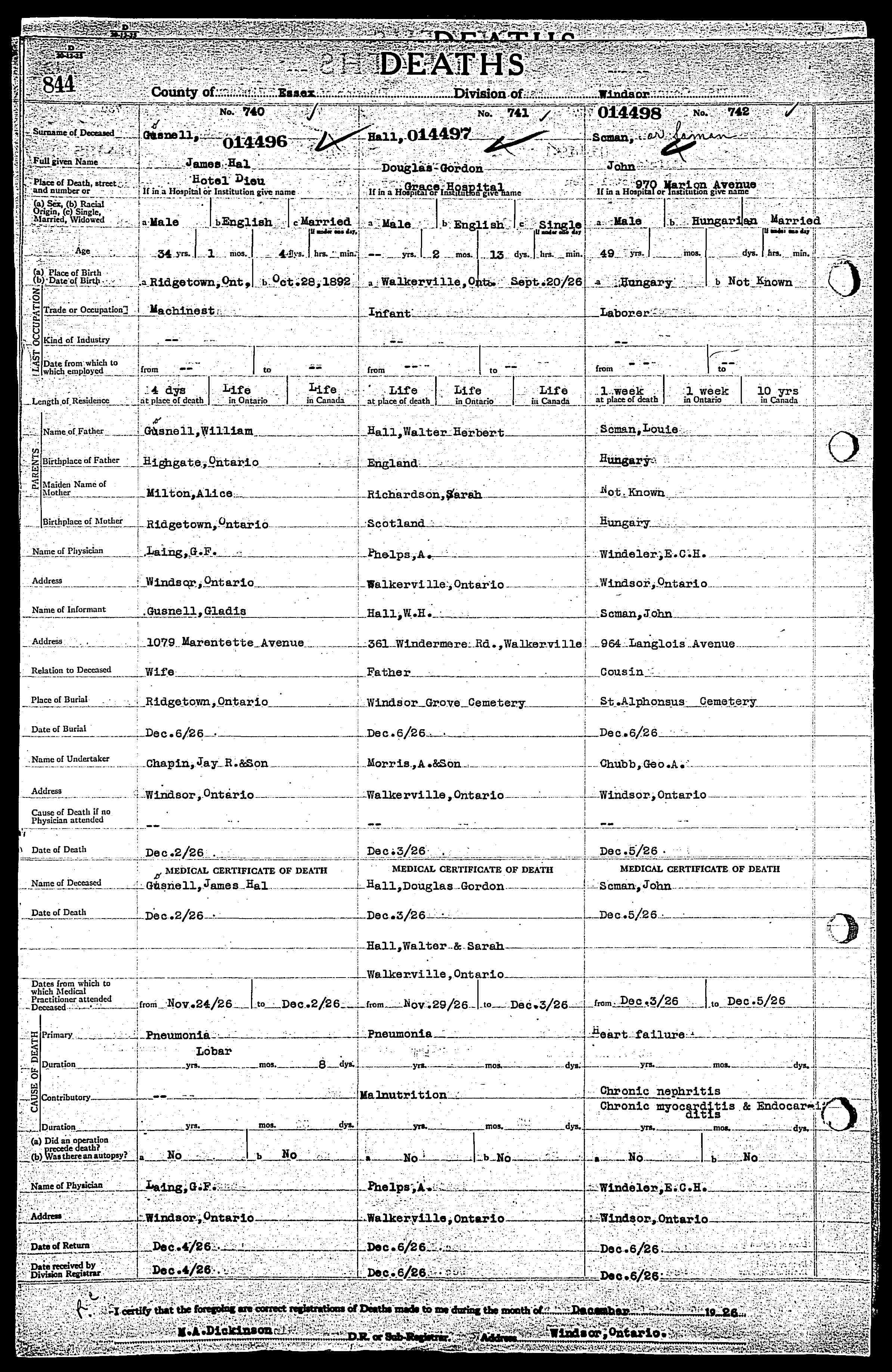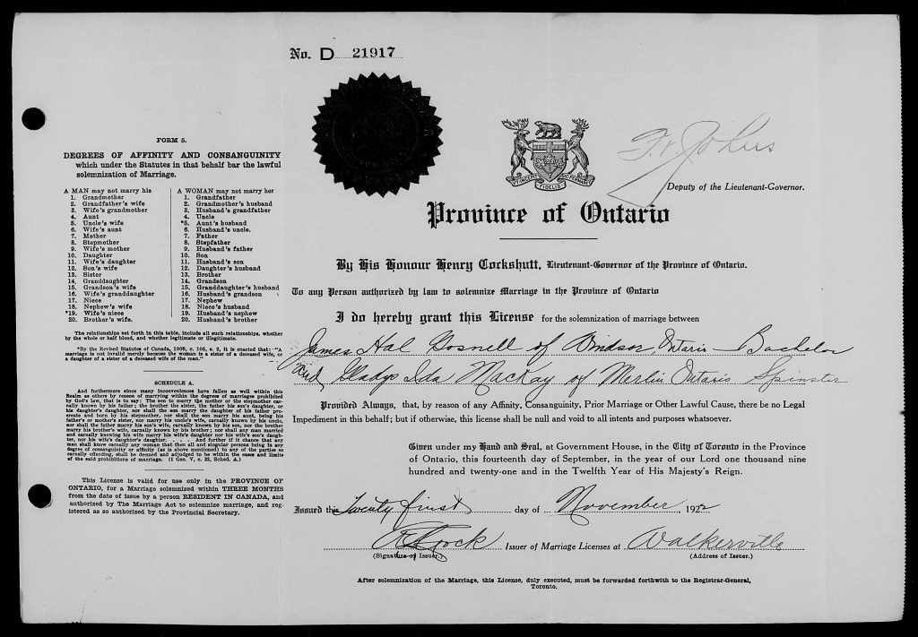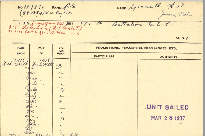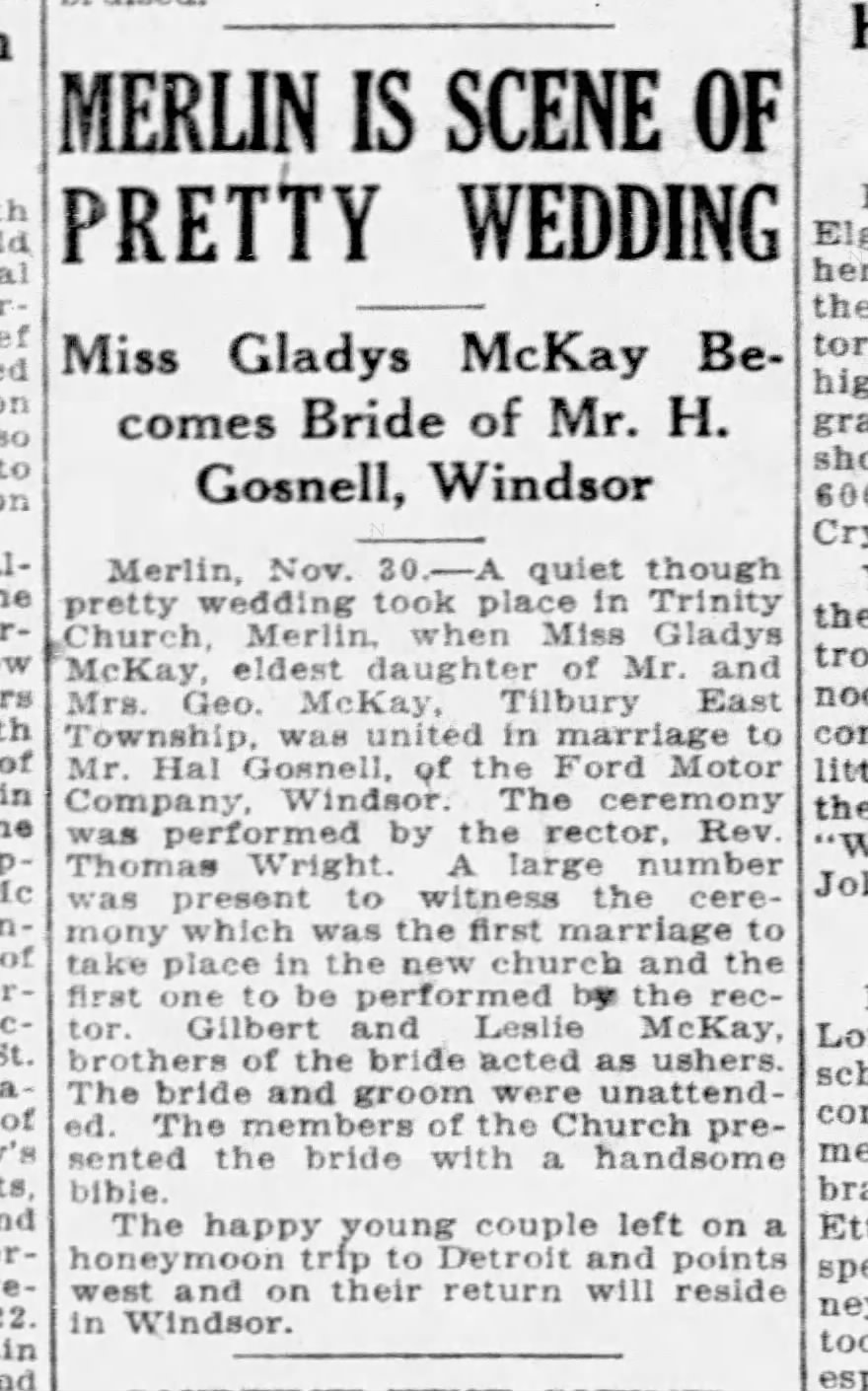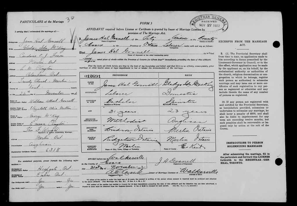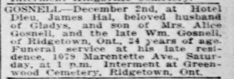 Family Search: When Private James Hal Gosnell was born in 1891, in Ontario, Canada, his father, William Albert Gosnell, was 34 and his mother, Alice Elizabeth Mitton, was 34. He married Gladys Ida McKay on 21 November 1922, in Walkerville, Windsor, Essex, Ontario, Canada. They were the parents of at least 1 daughter. He immigrated to Detroit, Wayne, Michigan, United States in 1910 and lived in Kent, Ontario, Canada in 1911 and Blenheim, Kent, Ontario, Canada in 1917. He registered for military service in 1917. In 1917, at the age of 26, his occupation is listed as printer in Blenheim Township, Oxford, Ontario, Canada. He died on 2 December 1926, in Essex, Ontario, Canada, at the age of 35, and was buried in Greenwood Cemetery, Ridgetown, Chatham-Kent, Ontario, Canada