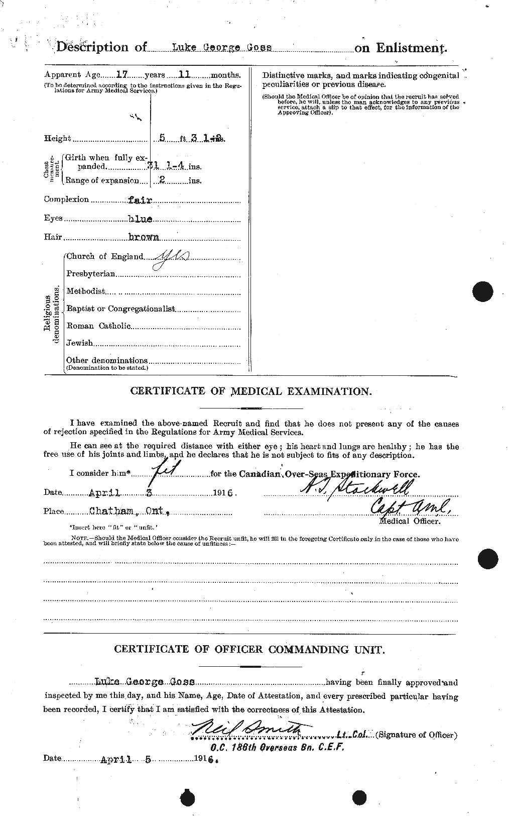 | April 3, 1916 | Enlists | This man enlists with the 186th Overseas Battalion at Chatham, Ontario. He is a 17-year, 11-month-old clerk residing at 329 Lacroix Street, Chatham, Ontario. He stands 5’3.5” tall and has a fair complexion, blue eyes, and brown hair. He weighs 113 pounds and has a chest of 29.25” with an expansion of 2”. He is a member of the Church of England. He may have been employed at J.L Hudson Company, Detroit, Michigan, before enlisting. |