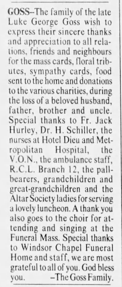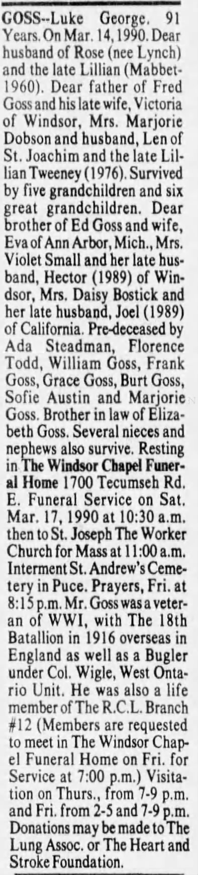 Family Search: When Private Luke George Goss Jr. was born on 21 May 1898, in Willesden, London, England, United Kingdom, his father, Luke George White Goss Sr., was 23 and his mother, Ada Maria Page, was 21. He married Lillian Mabbet on 24 June 1922, in Detroit, Wayne, Michigan, United States. They were the parents of at least 1 son and 2 daughters. He immigrated to Detroit, Wayne, Michigan, United States in 1932 and lived in Washtenaw, Michigan, United States in 1920 and Addison Township, Oakland, Michigan, United States in 1930. In 1915, at the age of 17, his occupation is listed as clerk in Chatham, Kent, Ontario, Canada. He died on 14 March 1990, in Windsor, Essex, Ontario, Canada, at the age of 91, and was buried in Saint Andrew’s Presbyterian Cemetery, Belle River, Essex, Ontario, Canada.