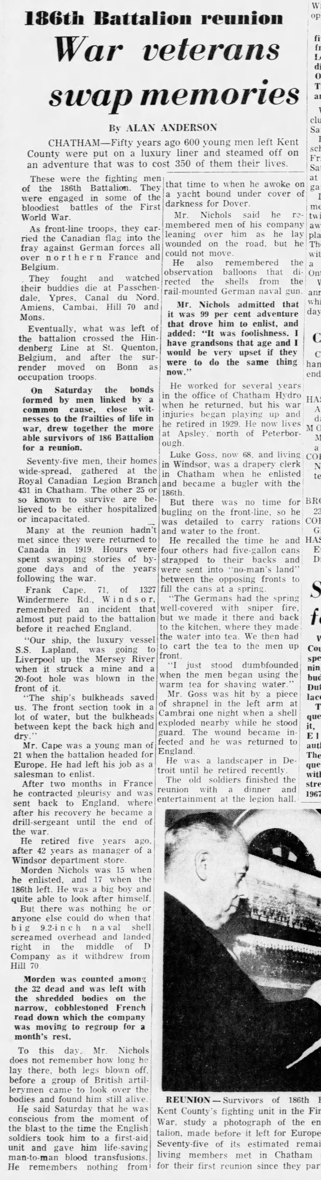 Private Luke George Goss went overseas with the 186th Battalion March 28th,1918 [sic], training at Bramshott Camp until September 8th, 1917, when he proceeded to France drafted to the 18th Battalion. He served until January 10th, 1918, when he was admitted to hospital with blood poisoning in the left arm, and returned to England January 22nd. After convalescence he was sent to Witley for discharge and left for Canada December 8th, 1918, arriving at Halifax December 14th.