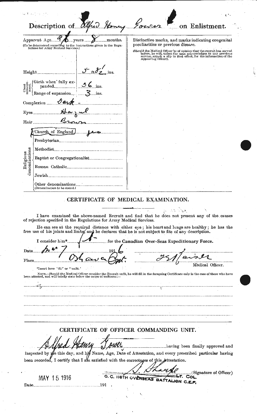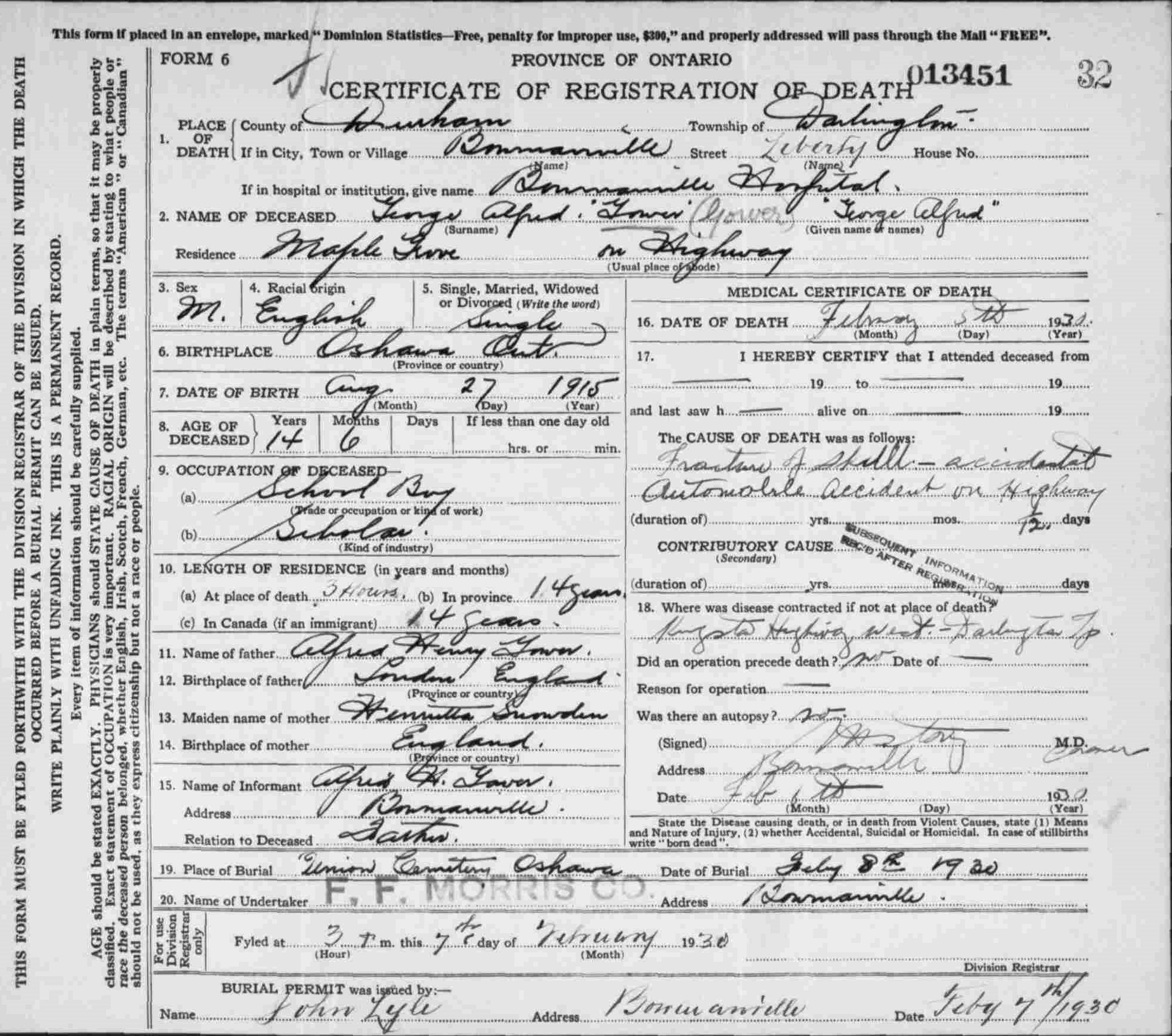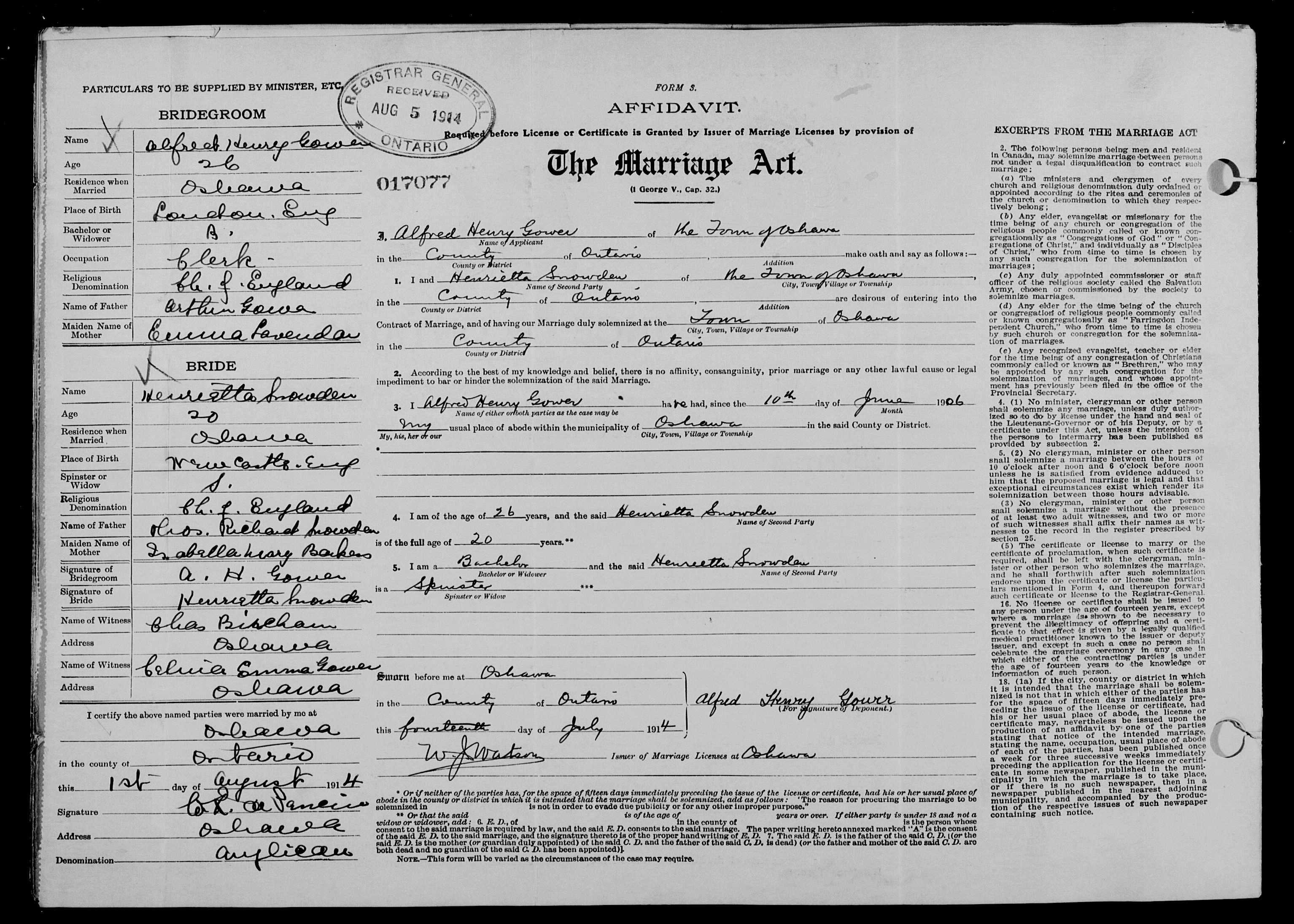 Family Search: When Alfred Henry Gower was born on 22 June 1888, in London, England, United Kingdom, his father, Arthur Gower, was 27 and his mother, Emma Lavender, was 21. He married Henrietta Snowden on 1 August 1914, in Ontario, Ontario, Canada. They were the parents of at least 1 son. He immigrated to Canada in 1902 and lived in Ontario, Ontario, Canada in 1911 and Oshawa, Ontario, Ontario, Canada for about 23 years. He registered for military service in 1916. In 1916, at the age of 28, his occupation is listed as stove mounter in Oshawa, Ontario, Ontario, Canada. He died on 12 January 1958, in Durham, Ontario, Canada, at the age of 69, and was buried in Oshawa Union Cemetery, Oshawa, Ontario, Ontario, Canada.