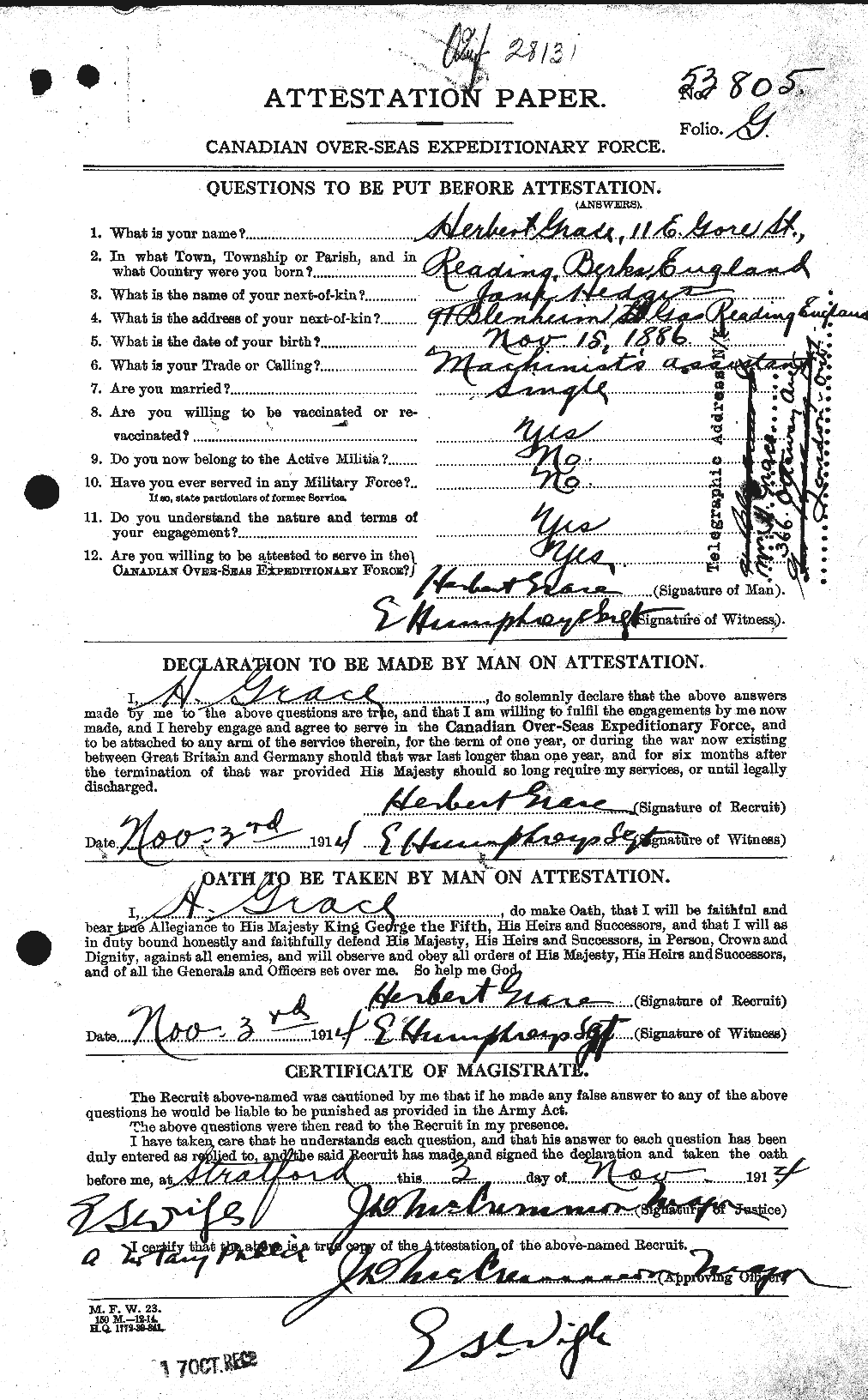 Invalided to England after a wound. Compound fracture to his left femur that, when it healed, left his leg 2.5 inches shorter than the right one.