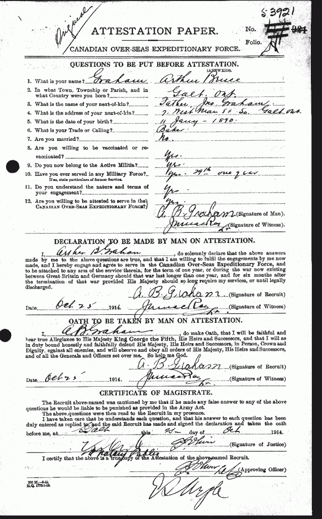 Graham, Arthur Bruce: Service no. 53921 Digitized Service Record Source: 18th Battalion Nominal Roll, April 1915. Find-A-Grave Source: Find-A-Grave. Photo added by ross. Share this: Click to email a link to a friend (Opens in new window) Email Click to share on Facebook (Opens in new window) Facebook Click to share on X (Opens in new window) X Click to share on Reddit (Opens in new window) Reddit Click to share on LinkedIn (Opens in new window) LinkedIn Click to print (Opens in new window) Print Click to share on Tumblr (Opens in new window) Tumblr Click to share on Pocket (Opens in new window) Pocket Click to share on Pinterest (Opens in new window) Pinterest Click to share on Telegram (Opens in new window) Telegram Click to share on WhatsApp (Opens in new window) WhatsApp Like Loading...