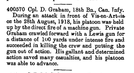 During an attack in front of Vis-en-Artois on the 28th August 1918, his platoon was held up by the direct fire of a machine gun. Private Graham Crawled forward with a Lewis gun for a distance of 100 yards under intense fire and succeeded in killing the crew and putting the gun out of action. His gallant and determined action saved many casualties, and his platoon was able to advance.