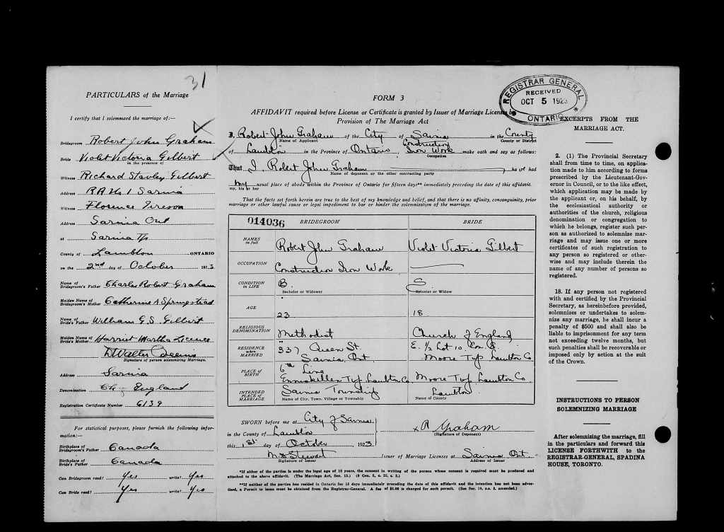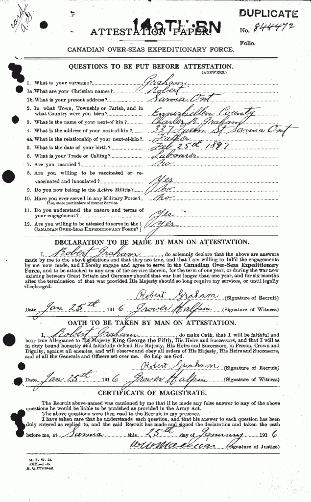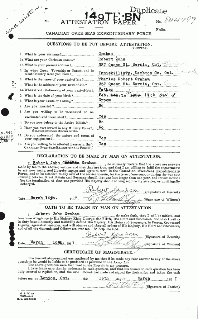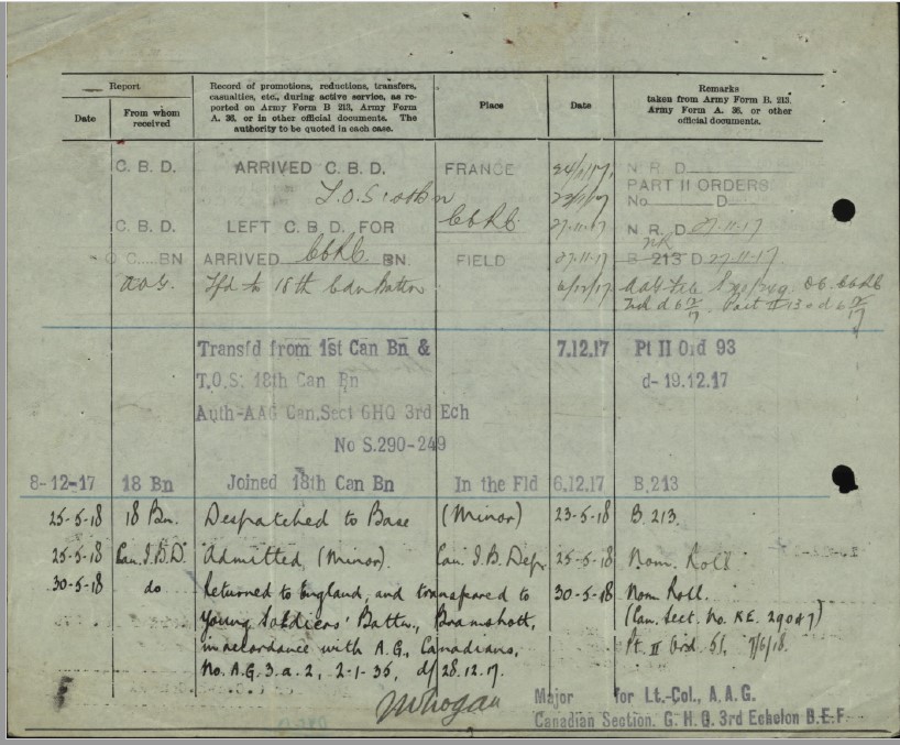 Note: Underage soldier born February 25, 1900. Demobilization records indicate he served with the 18th Battalion from December 6, 1917 until May 23, 1918. He later deserted the army and was pardoned after the war.