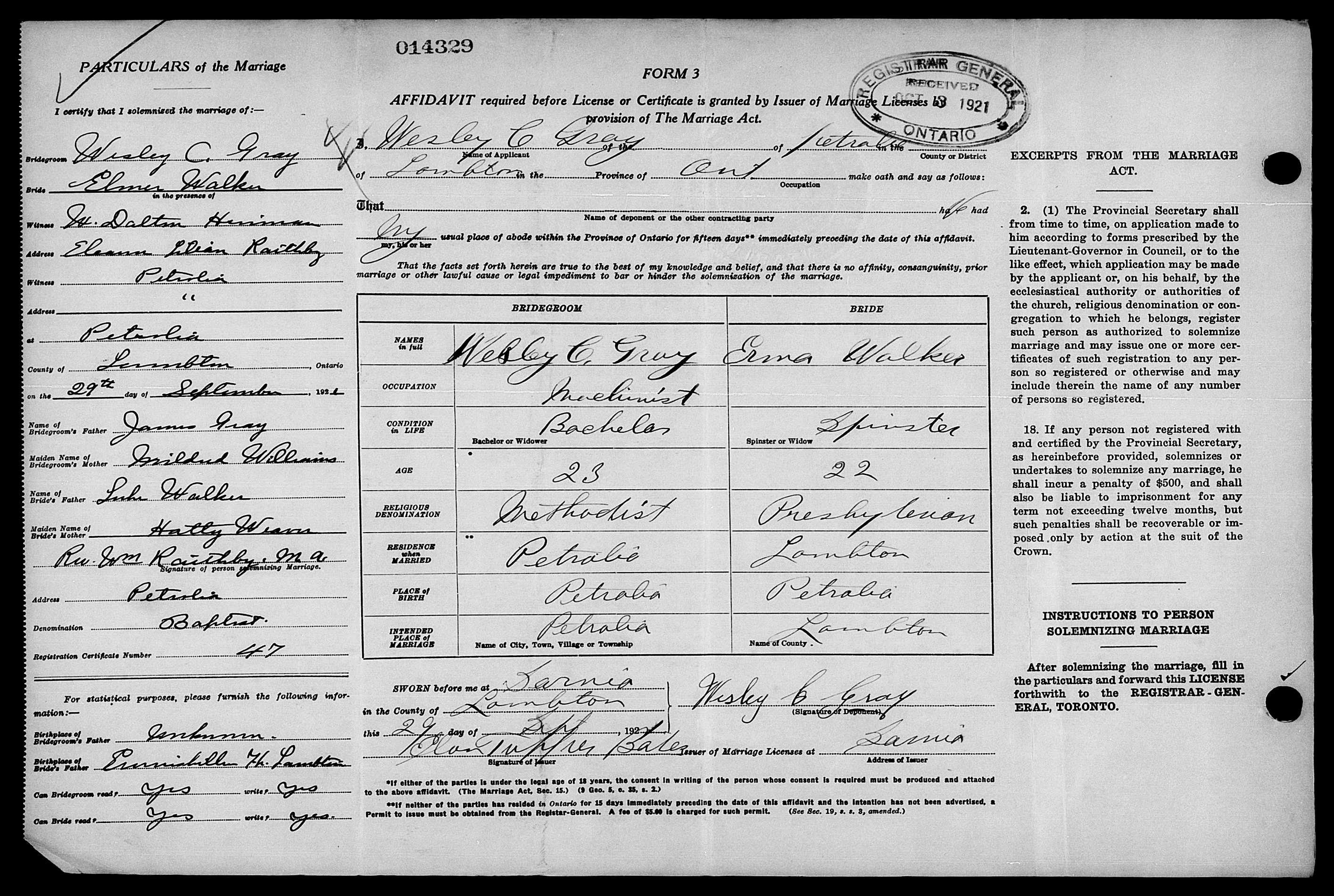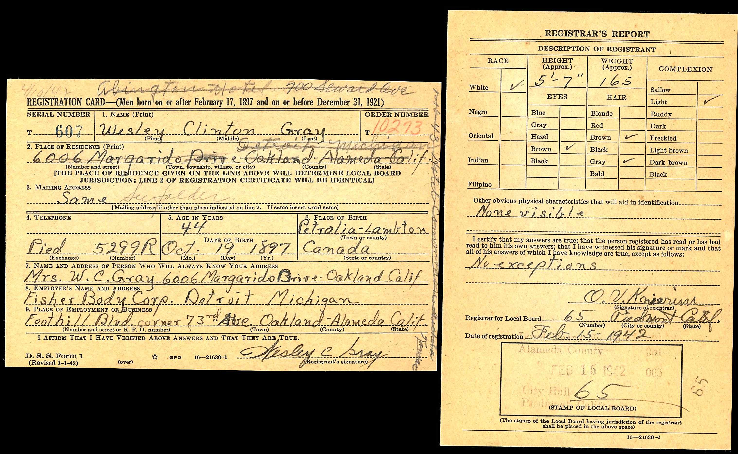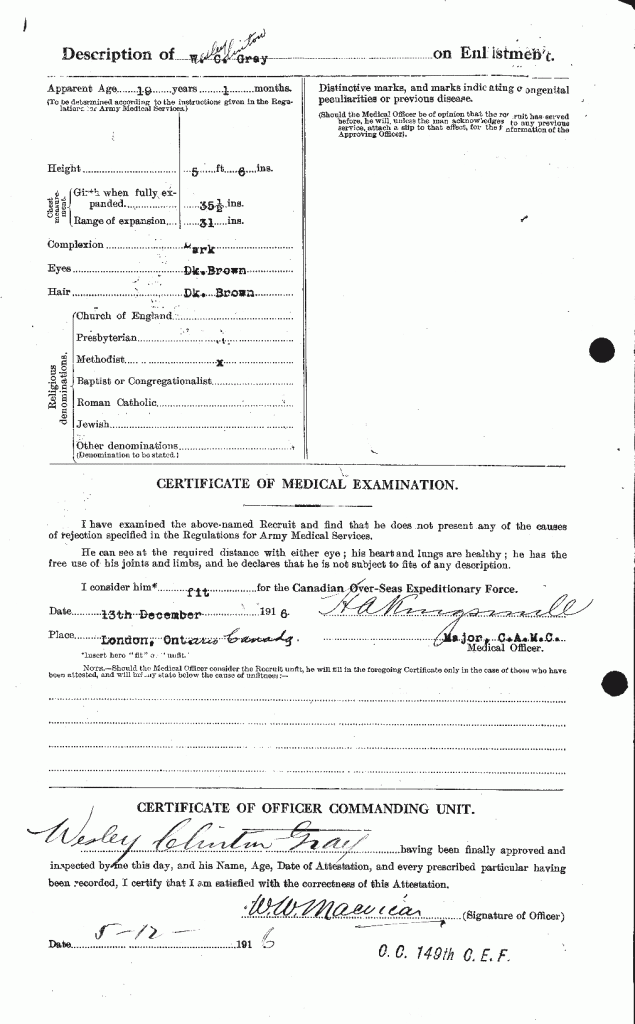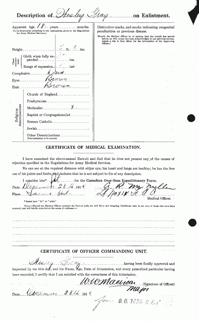 Family Search: When Private Wesley Clinton Gray MM was born on 19 April 1897, in Petrolia, Lambton, Ontario, Canada, his father, James Robert Gray, was 29 and his mother, Mildred Ada Williams, was 25. He married Erma Walker on 29 September 1921, in Petrolia, Lambton, Ontario, Canada. They were the parents of at least 1 son and 1 daughter. He registered for military service in 1915. In 1915, at the age of 18, his occupation is listed as farmer. He died on 8 September 1955, in Alameda, California, United States, at the age of 58, and was buried in Chapel of the Chimes Columbarium and Mausoleum, Oakland, Alameda, California, United States.