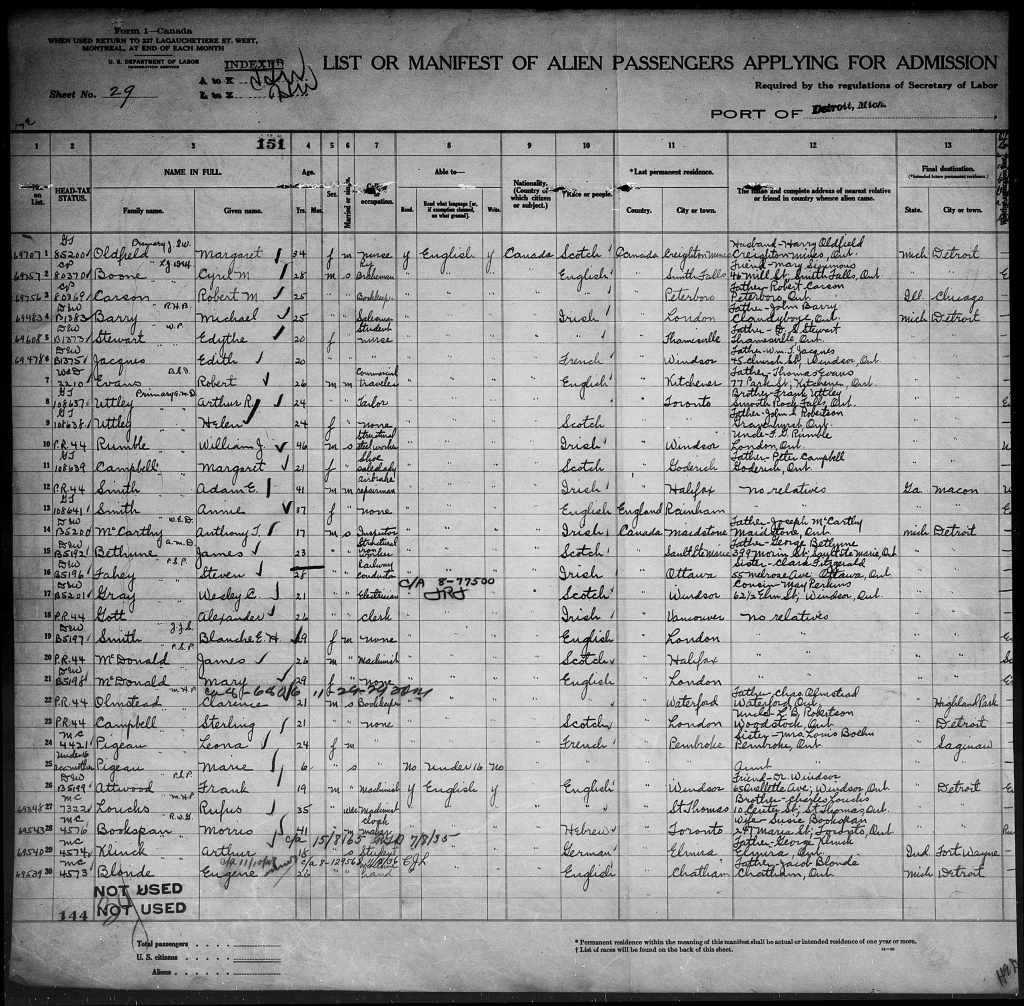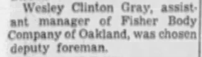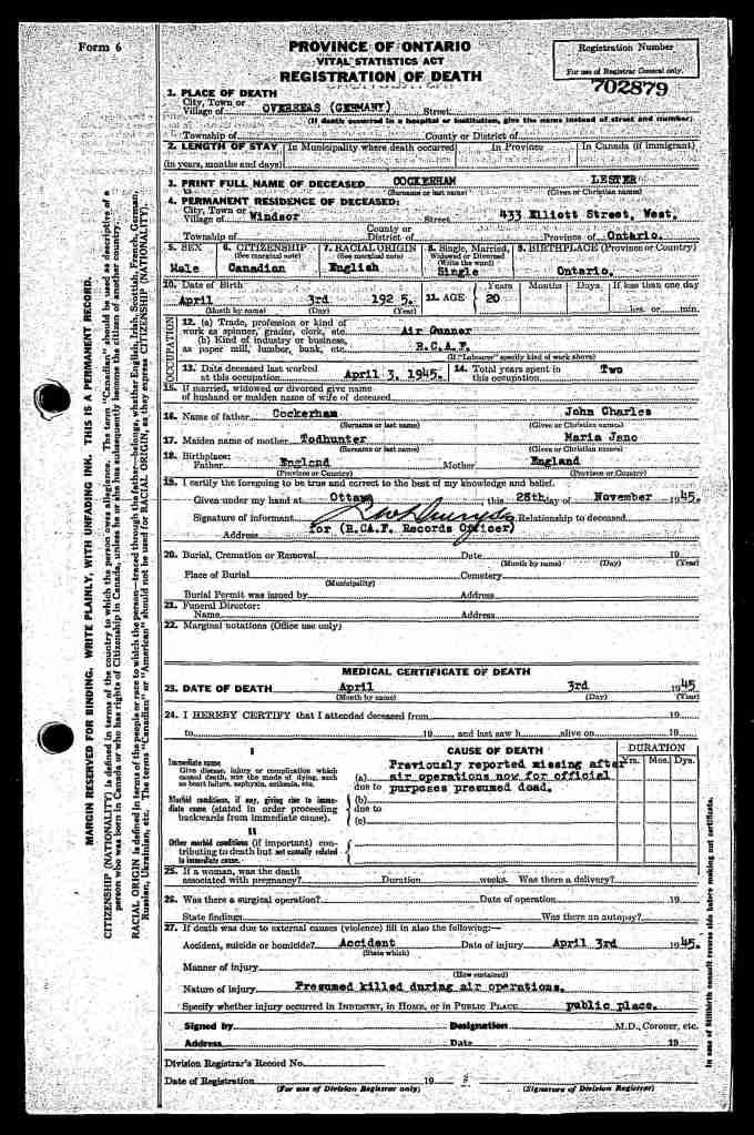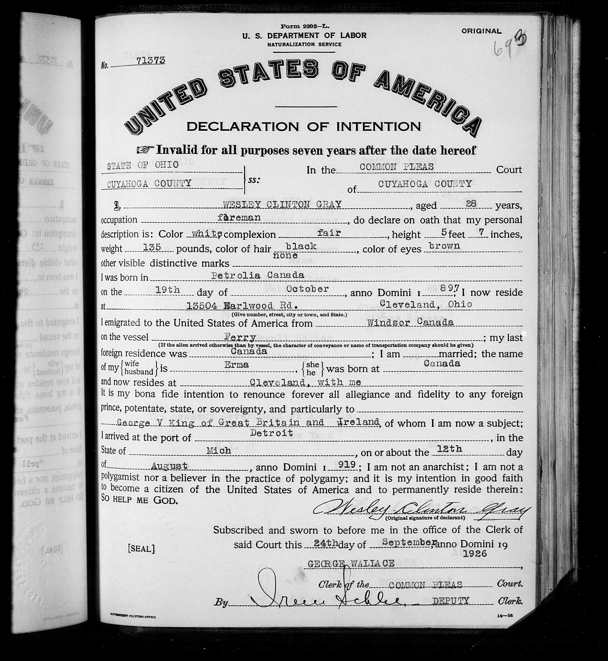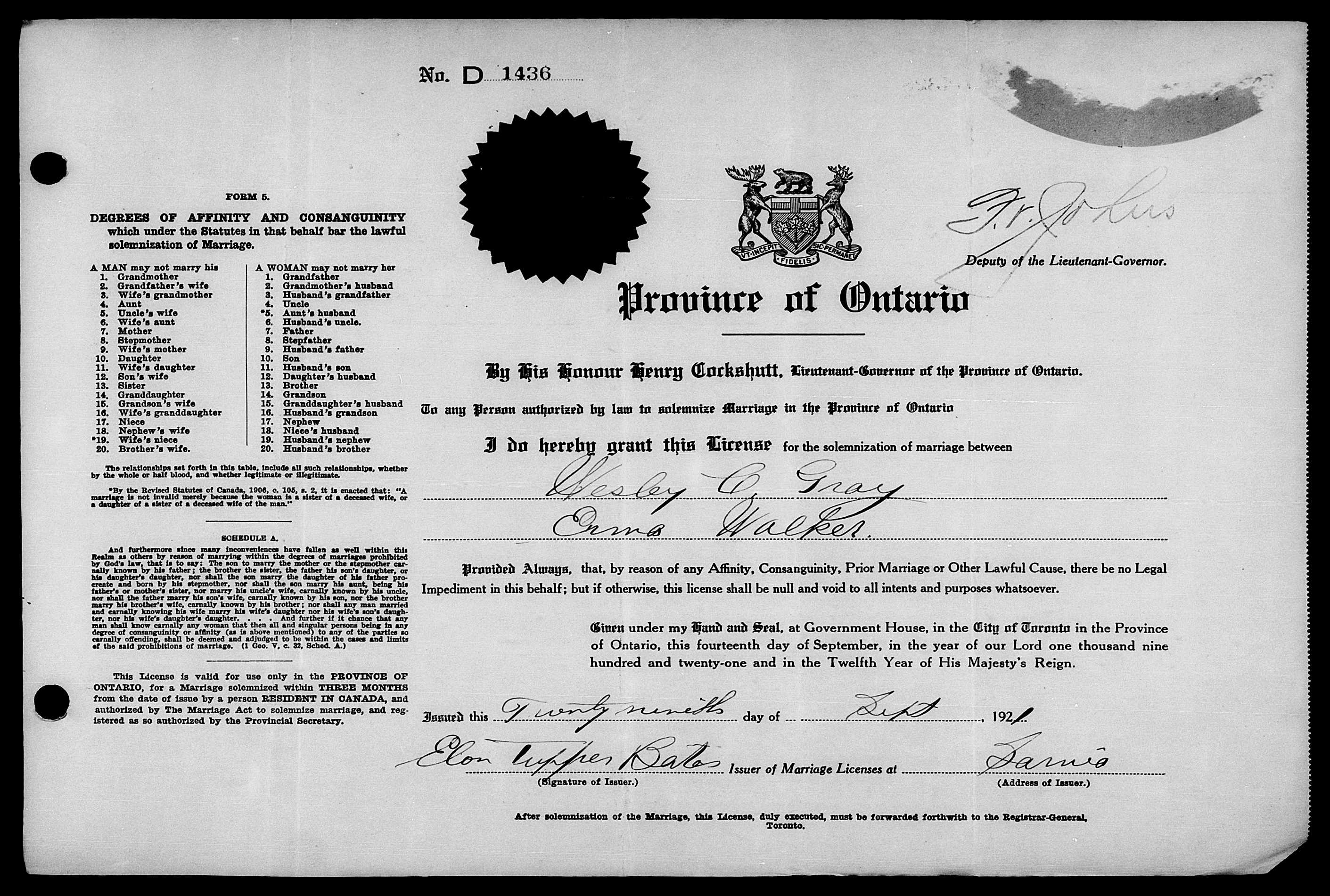 Family Search: When Private Wesley Clinton Gray MM was born on 19 April 1897, in Petrolia, Lambton, Ontario, Canada, his father, James Robert Gray, was 29 and his mother, Mildred Ada Williams, was 25. He married Erma Walker on 29 September 1921, in Petrolia, Lambton, Ontario, Canada. They were the parents of at least 1 son and 1 daughter. He registered for military service in 1915. In 1915, at the age of 18, his occupation is listed as farmer. He died on 8 September 1955, in Alameda, California, United States, at the age of 58, and was buried in Chapel of the Chimes Columbarium and Mausoleum, Oakland, Alameda, California, United States.