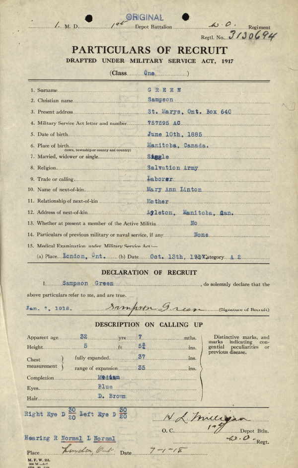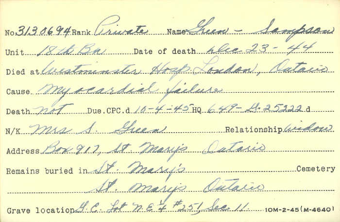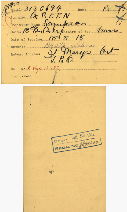 Family Search: Private Sampson Green was born on 10 June 1885, in Manitoba, Canada as the son of Thomas S Green and Mary Ann Pullbrook. He married Mary Isabelle Hodgson on 28 May 1919, in London Township, Middlesex, Ontario, Canada. He lived in Arthur Rural Municipality, Manitoba, Canada in 1891 and St Marys, Ontario, Canada in 1922. He registered for military service in 1918. In 1918, at the age of 33, his occupation is listed as labourer in St Marys, Ontario, Canada. He died on 23 December 1944, in London, Ontario, Canada, at the age of 59, and was buried in St Marys Cemetery, St Marys, Ontario, Canada.