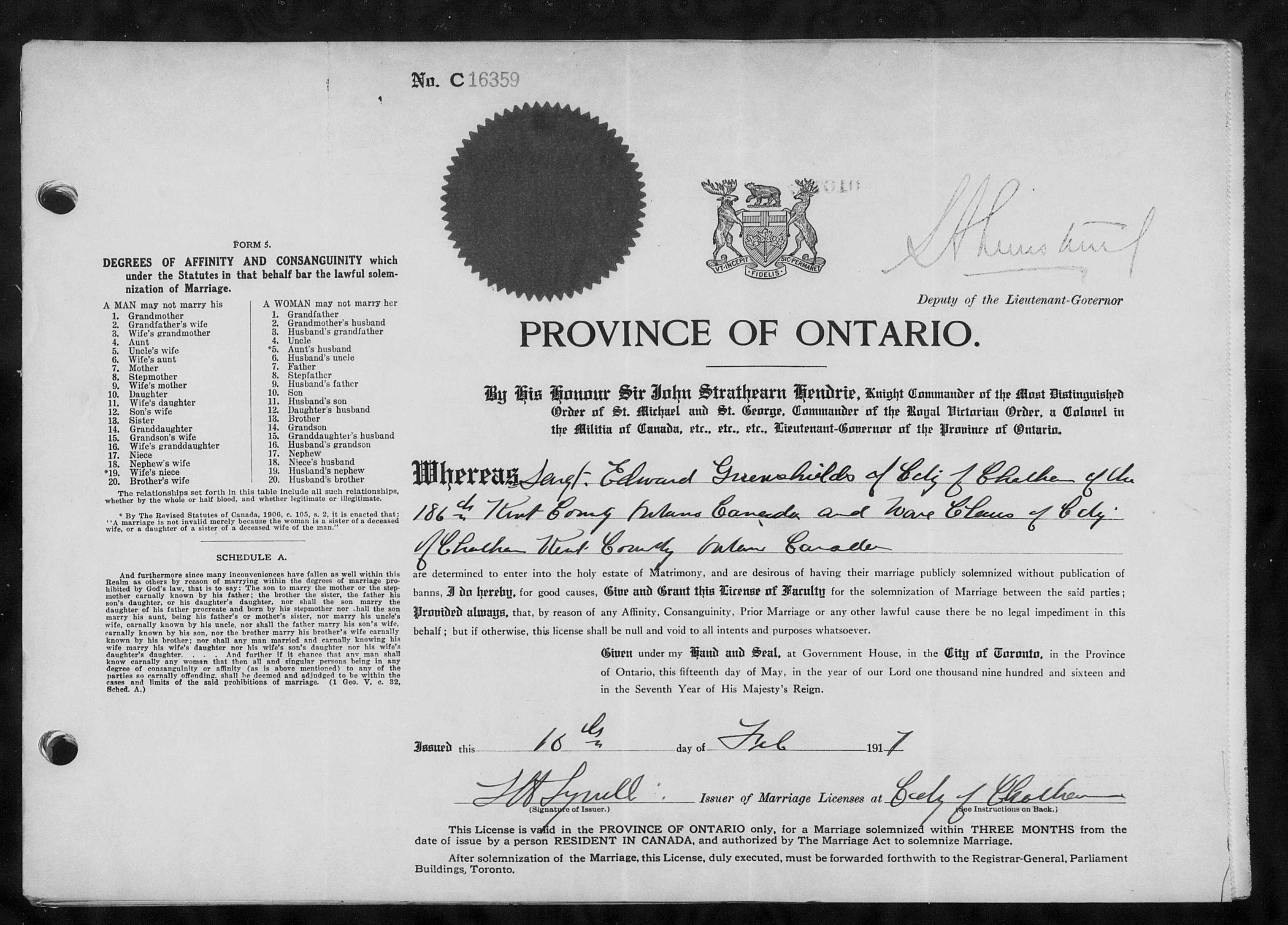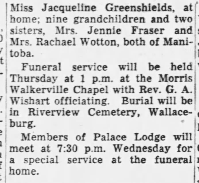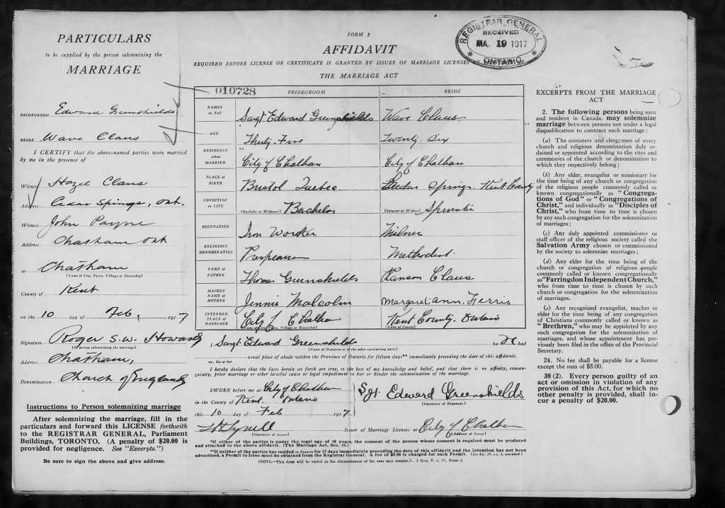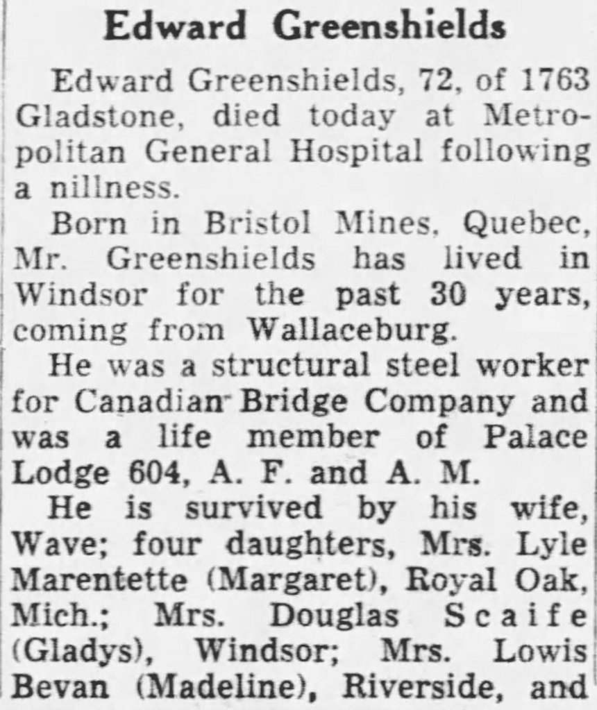 Family Search: When Private Edward Greenshields was born on 20 January 1882, in Bristol, Pontiac, Quebec, Canada, his father, Thomas Greenshields, was 51 and his mother, Jane Janet Malcolm, was 47. He married Wave Clause on 10 February 1917, in Chatham, Kent, Ontario, Canada. They were the parents of at least 1 son and 6 daughters. He lived in Bristol Ridge, Bristol, Pontiac, Quebec, Canada in 1891 and Wallaceburg, Chatham-Kent, Ontario, Canada in 1916. He registered for military service in 1816. In 1916, at the age of 34, his occupation is listed as structure ironworker in Wallaceburg, Chatham-Kent, Ontario, Canada. He died on 26 October 1954, in Windsor, Essex, Ontario, Canada, at the age of 72, and was buried in Riverview Cemetery, Wallaceburg, Kent, Ontario, Canada.