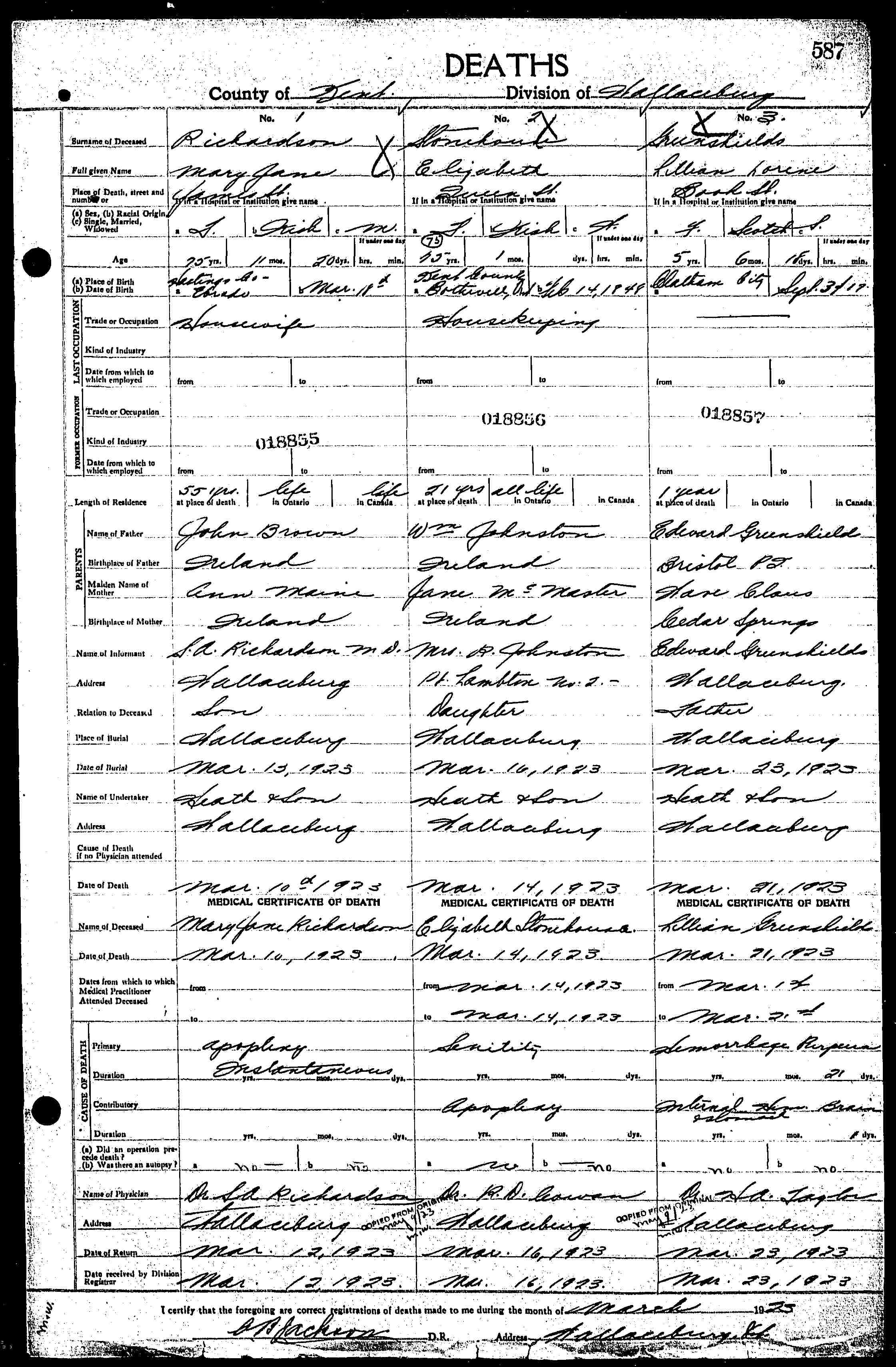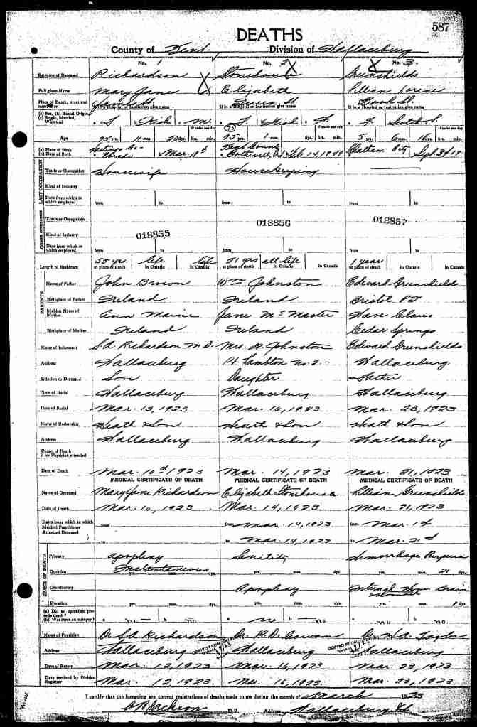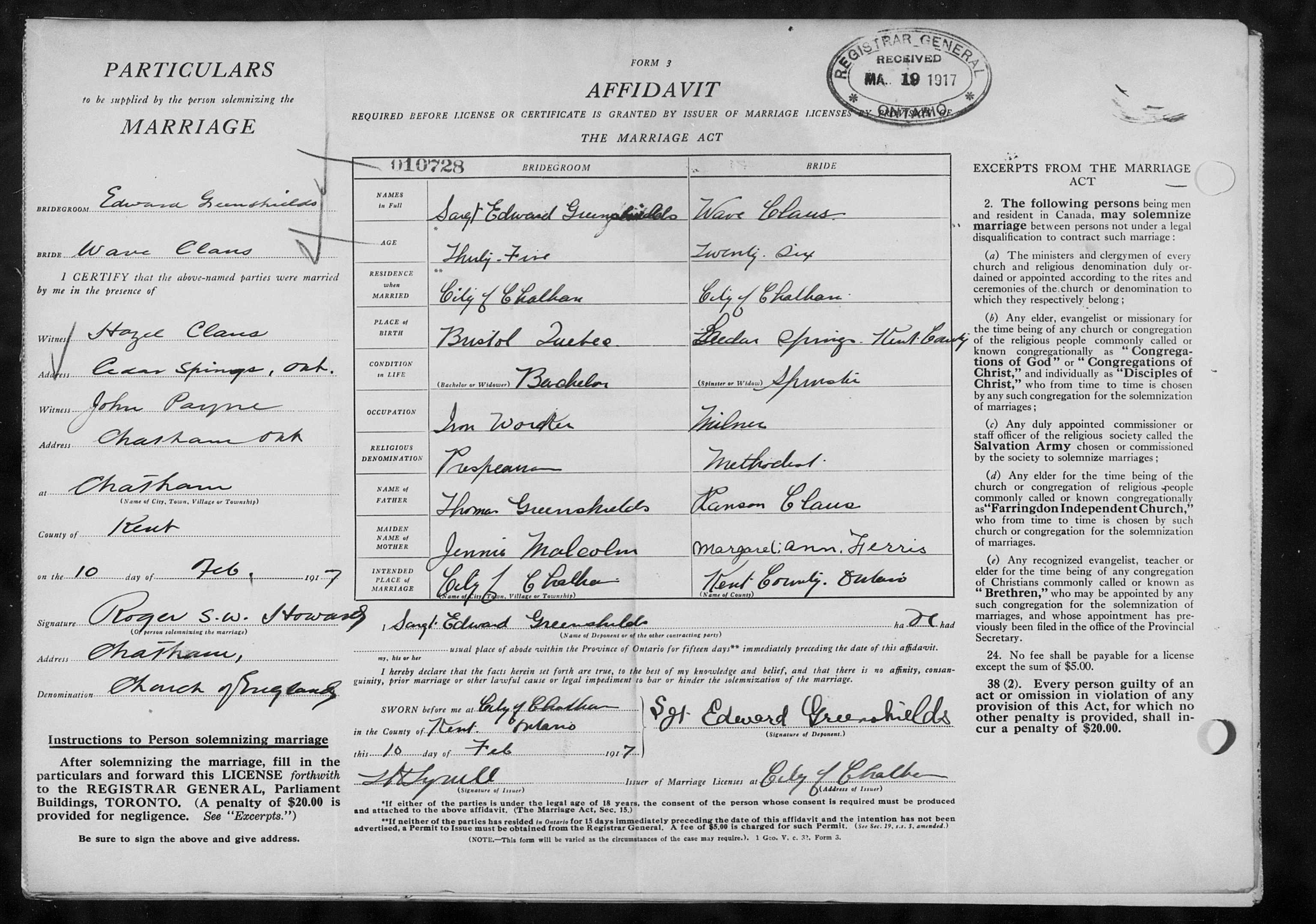 Family Search: When Private Edward Greenshields was born on 20 January 1882, in Bristol, Pontiac, Quebec, Canada, his father, Thomas Greenshields, was 51 and his mother, Jane Janet Malcolm, was 47. He married Wave Clause on 10 February 1917, in Chatham, Kent, Ontario, Canada. They were the parents of at least 1 son and 6 daughters. He lived in Bristol Ridge, Bristol, Pontiac, Quebec, Canada in 1891 and Wallaceburg, Chatham-Kent, Ontario, Canada in 1916. He registered for military service in 1816. In 1916, at the age of 34, his occupation is listed as structure ironworker in Wallaceburg, Chatham-Kent, Ontario, Canada. He died on 26 October 1954, in Windsor, Essex, Ontario, Canada, at the age of 72, and was buried in Riverview Cemetery, Wallaceburg, Kent, Ontario, Canada.