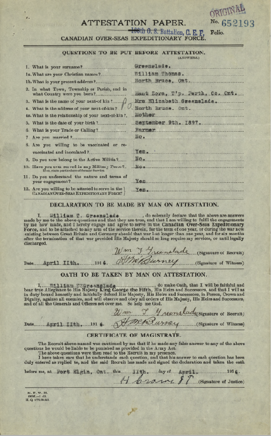 Greenslade, William Thomas: Service no. 652193 Digitized Service Record Source: Per research by 160th Battalion Facebook Group. Confirmed served with 18th Battalion. Find-A-Grave Share this: Click to email a link to a friend (Opens in new window) Email Click to share on Facebook (Opens in new window) Facebook Click to share on X (Opens in new window) X Click to share on Reddit (Opens in new window) Reddit Click to share on LinkedIn (Opens in new window) LinkedIn Click to print (Opens in new window) Print Click to share on Tumblr (Opens in new window) Tumblr Click to share on Pocket (Opens in new window) Pocket Click to share on Pinterest (Opens in new window) Pinterest Click to share on Telegram (Opens in new window) Telegram Click to share on WhatsApp (Opens in new window) WhatsApp Like Loading...