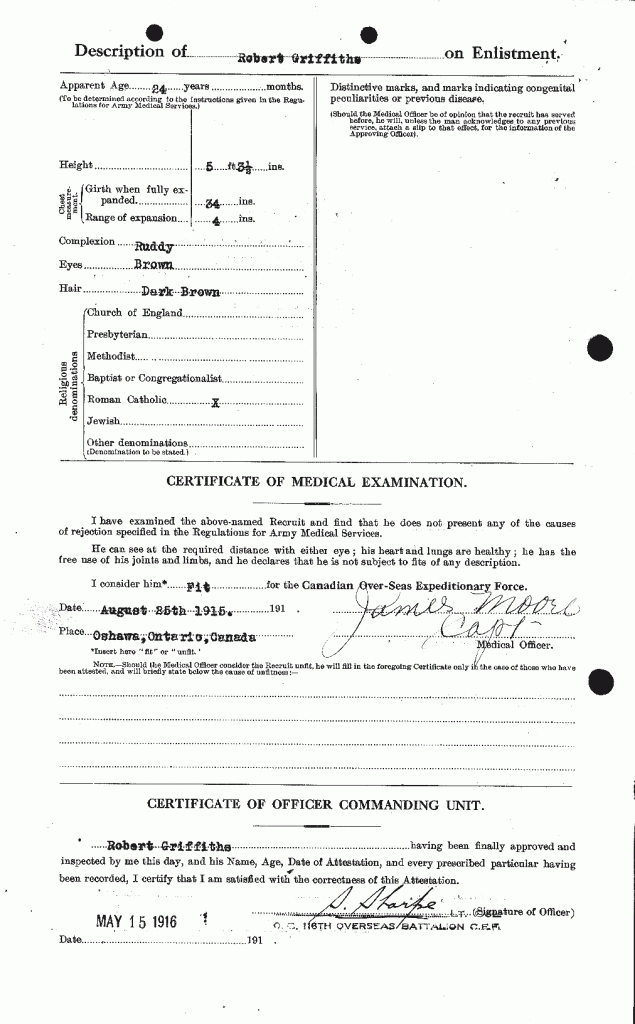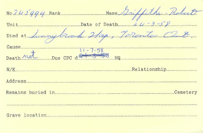 Family Search: Robert Griffiths was born on 15 December 1891, in Whitechapel, London, England, United Kingdom as the son of Margaret Griffiths. He lived in Oshawa, Durham, Ontario, Canada for about 7 years. He registered for military service in 1915. In 1915, at the age of 24, his occupation is listed as coremaker in Oshawa, Durham, Ontario, Canada. He died on 24 March 1958, in Toronto, Ontario, Canada, at the age of 66, and was buried in Saint Gregory’s Catholic Cemetery, Oshawa, Ontario, Ontario, Canada.