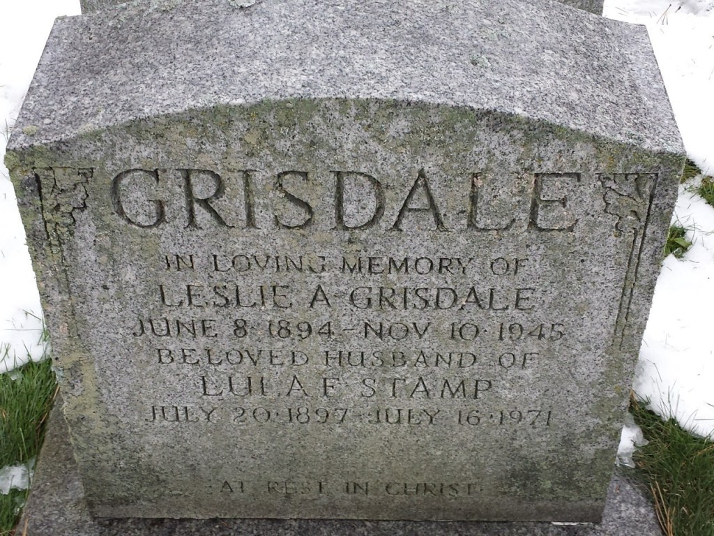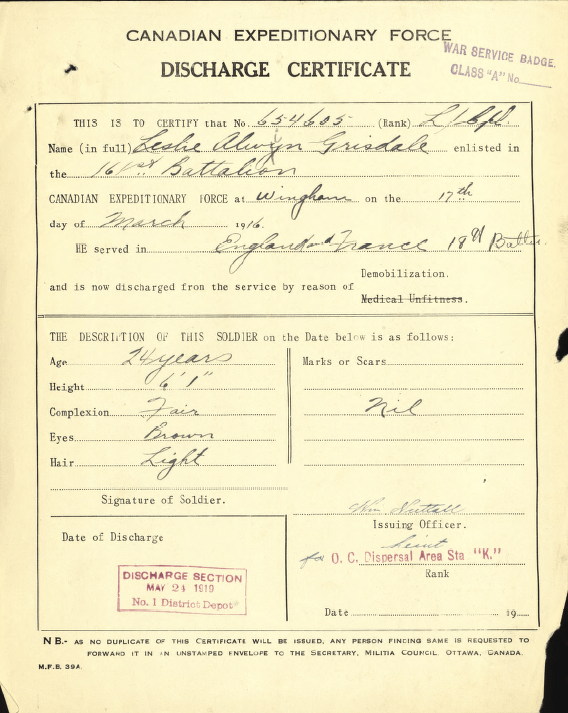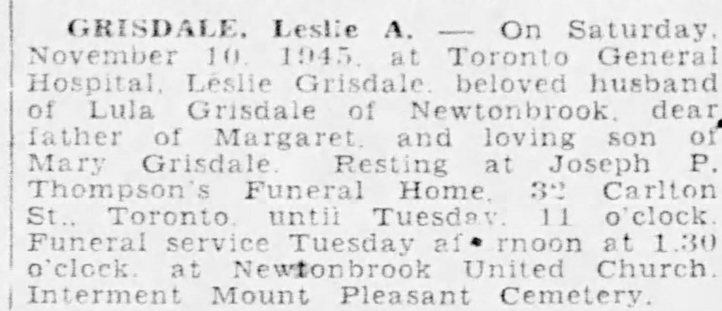 Family Search: When Lance Corporal Leslie Alwyn Grisdale was born on 8 June 1894, in Petrolia, Lambton, Ontario, Canada, his father, Arthur Grisdale, was 36 and his mother, Mary Littlefair, was 32. He married Lula Eliza Stamp on 8 April 1921, in Toronto, Ontario, Canada. They were the parents of at least 1 daughter. He immigrated to Halifax, Nova Scotia, Canada in 1919 and lived in Huron, Ontario, Canada for about 10 years and Toronto, York, Ontario, Canada in 1922. He registered for military service in 1916. His occupation is listed as merchant in Wingham, Huron, Ontario, Canada. He died on 10 November 1945, in Toronto, Ontario, Canada, at the age of 51, and was buried in Mount Pleasant Cemetery, Toronto, Ontario, Canada.