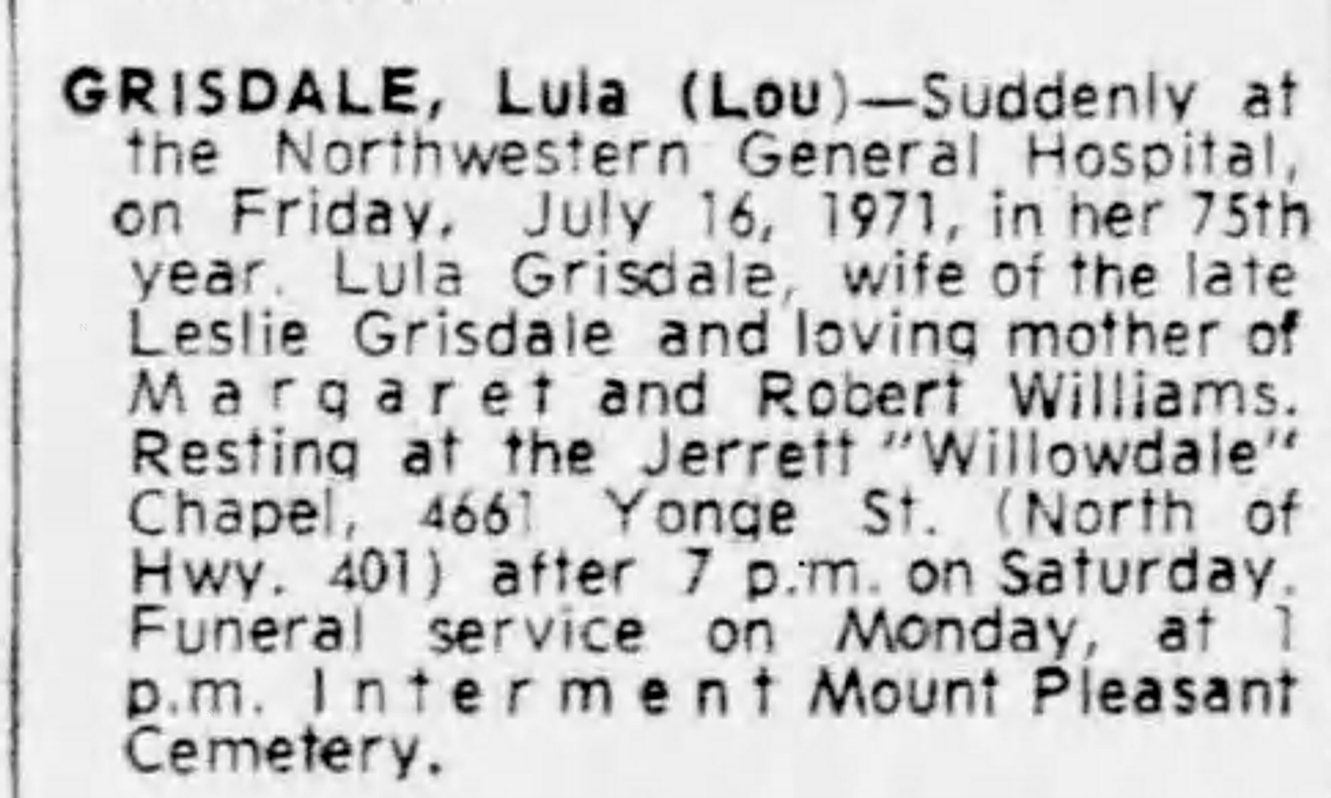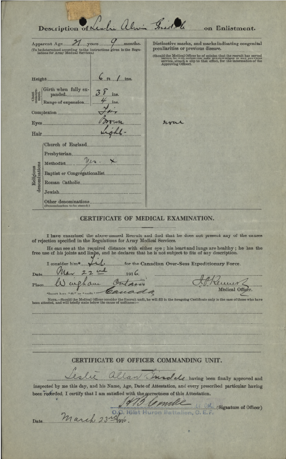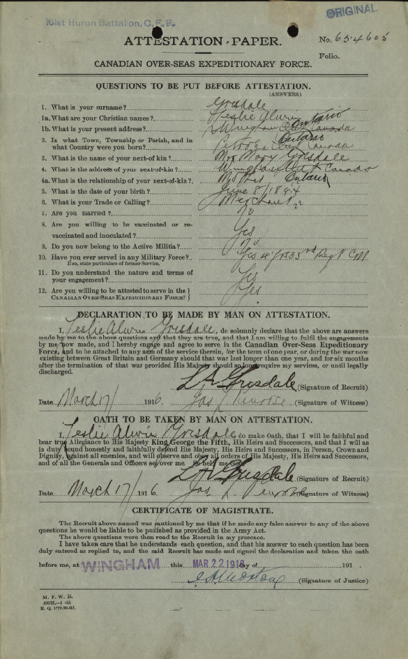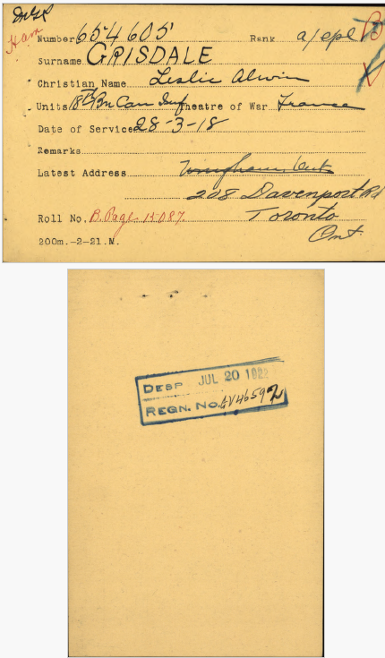 Family Search: When Lance Corporal Leslie Alwyn Grisdale was born on 8 June 1894, in Petrolia, Lambton, Ontario, Canada, his father, Arthur Grisdale, was 36 and his mother, Mary Littlefair, was 32. He married Lula Eliza Stamp on 8 April 1921, in Toronto, Ontario, Canada. They were the parents of at least 1 daughter. He immigrated to Halifax, Nova Scotia, Canada in 1919 and lived in Huron, Ontario, Canada for about 10 years and Toronto, York, Ontario, Canada in 1922. He registered for military service in 1916. His occupation is listed as merchant in Wingham, Huron, Ontario, Canada. He died on 10 November 1945, in Toronto, Ontario, Canada, at the age of 51, and was buried in Mount Pleasant Cemetery, Toronto, Ontario, Canada.