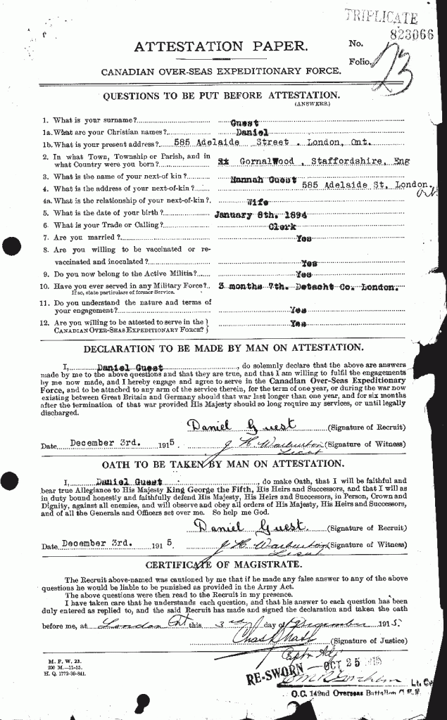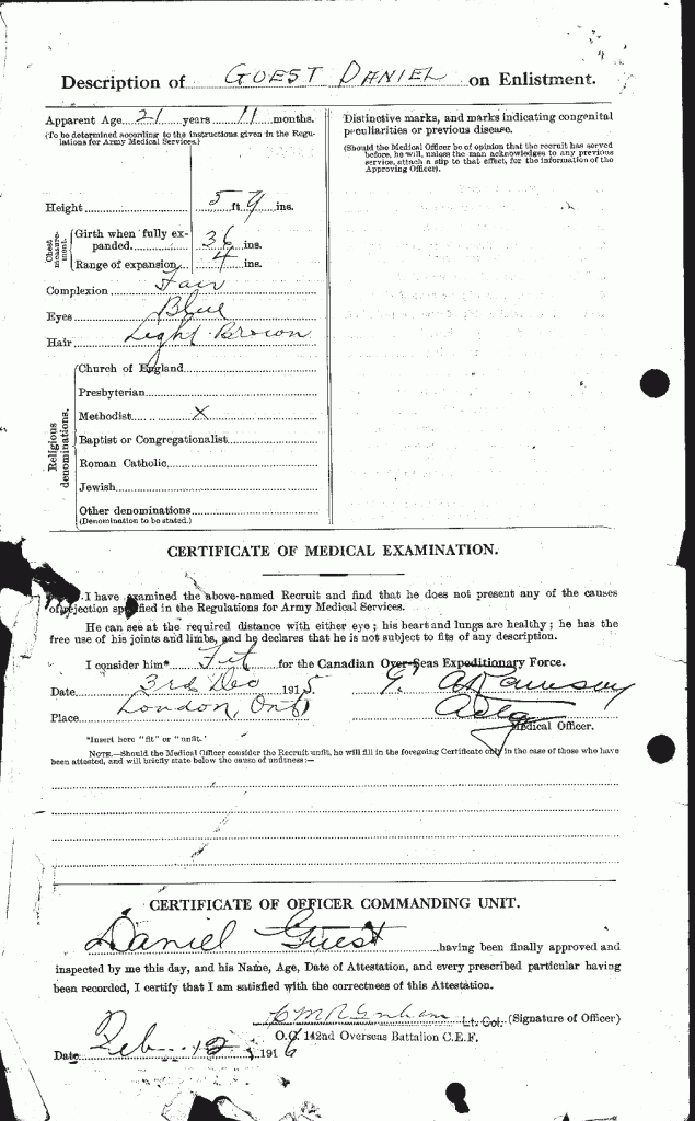 Family Search: Daniel Guest was born on 8 January 1894, in Gornalwood, Staffordshire, England, United Kingdom. He lived in London, Ontario, Canada in 1915 and Lower Gornal, Staffordshire, England, United Kingdom in 1922. He registered for military service in 1915. In 1915, at the age of 21, his occupation is listed as clerk in London, Ontario, Canada. He died on 21 March 1972, in England, United Kingdom, at the age of 78.